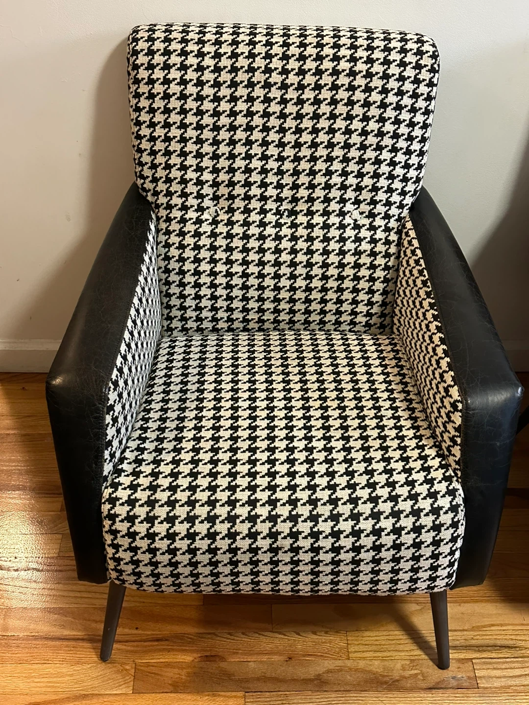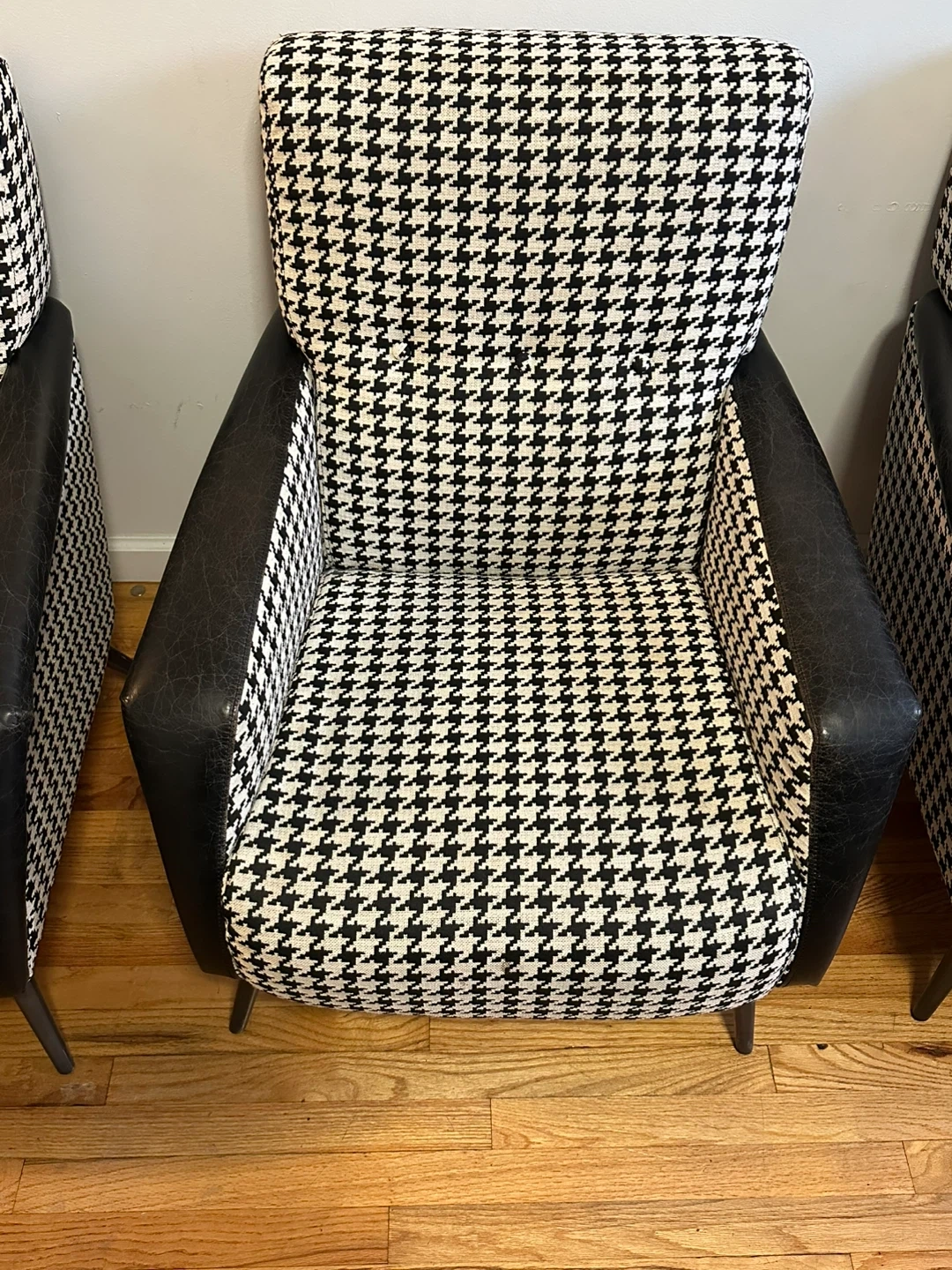 Selling a set of four armchairs featuring a classic houndstooth pattern. The chairs have black armrests and legs, offering a stylish and timeless look for any living space. They are in good condition and ready to add some flair to your home!
