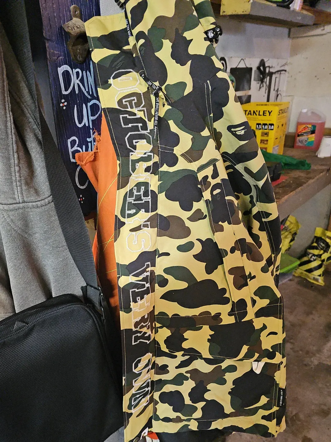 This is an A Bathing Ape jacket featuring their signature camo pattern. It's made with durable material. Definitely a statement piece for any streetwear collection!