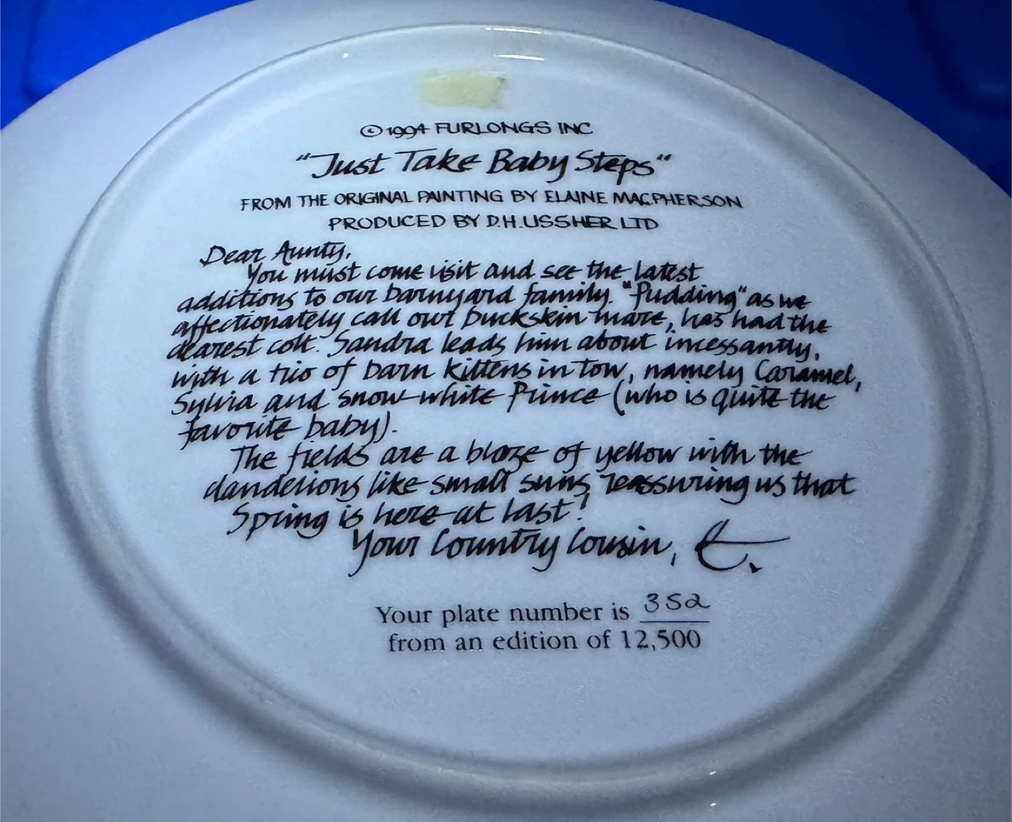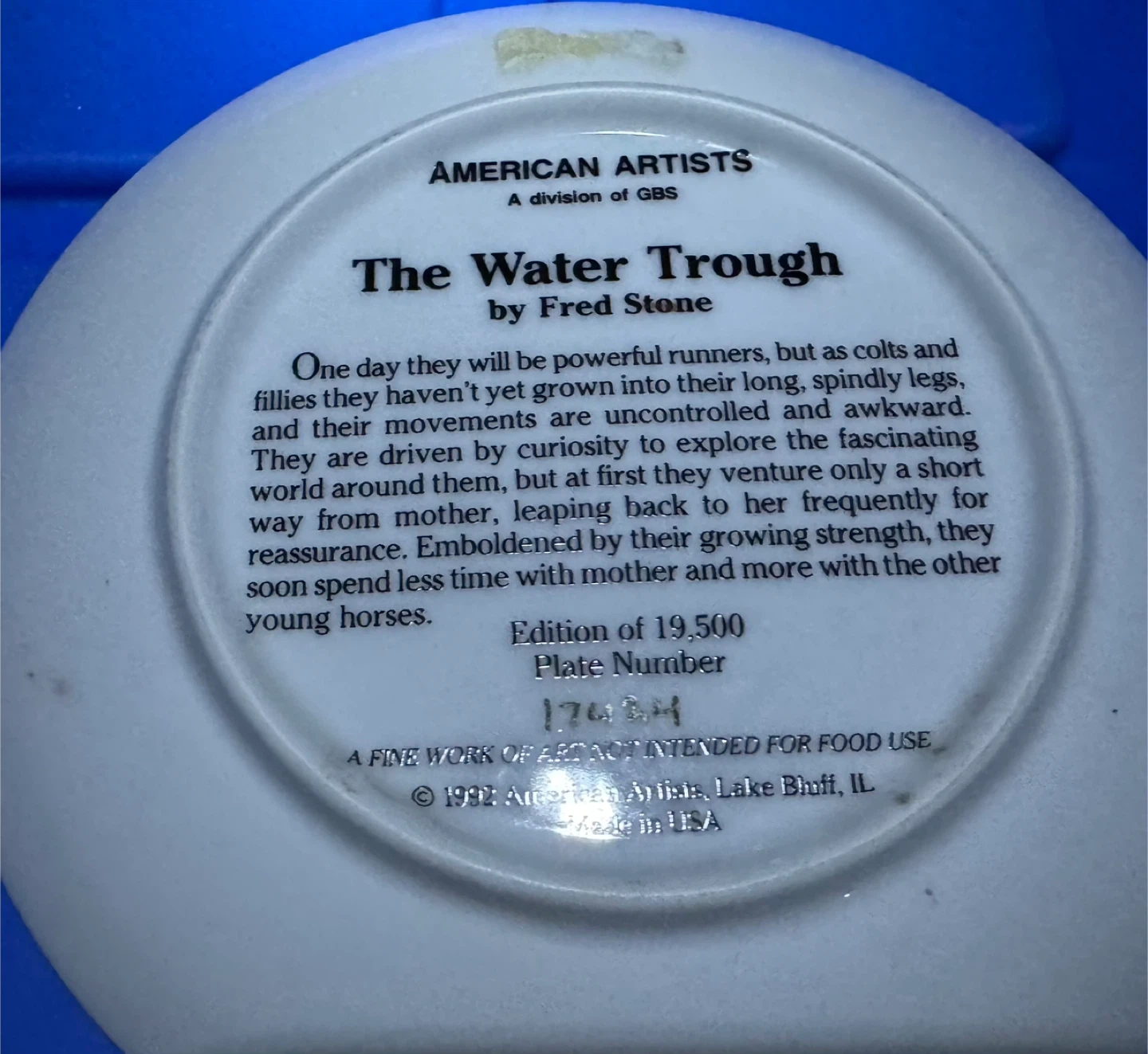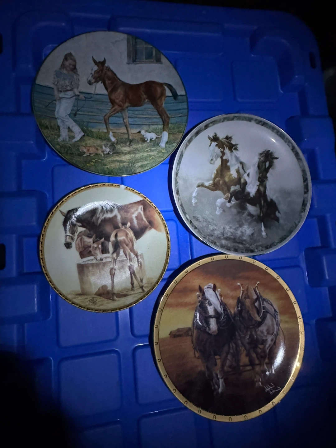 Collection of four decorative plates featuring horse artwork. Includes "Thundering Hooves" by Chuck DeHaan, "Just Take Baby Steps" by Elaine Macpherson, "Dawn 'til Dusk" by Adeline Halvorson, and "The Water Trough" by Fred Stone. Primarily for display purposes. $15 each. Located in Penticton