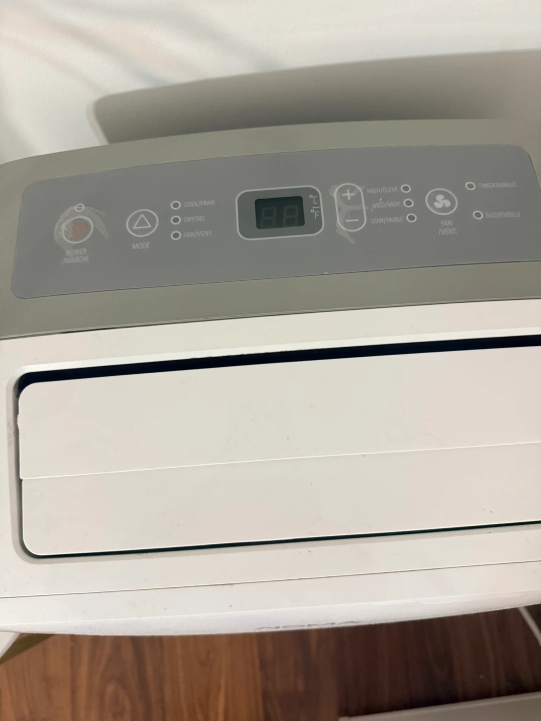 This is a NOMA portable air conditioner. It has multiple modes including cool, dry, and fan. The unit features adjustable fan speeds and a timer function.