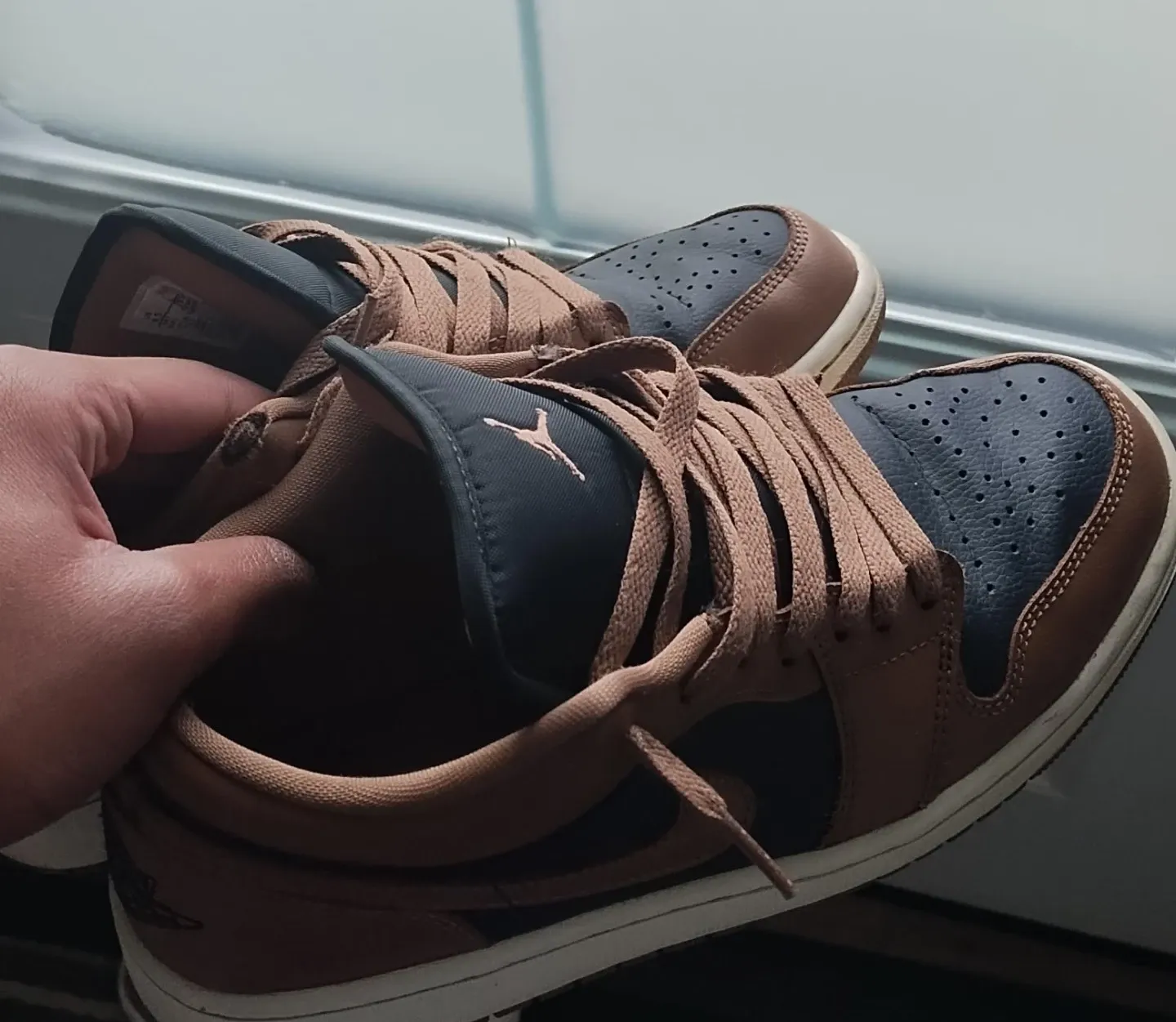 These are Air Jordan 1 Low sneakers. They're made with a mix of brown and navy leather. The Jordan Jumpman logo is visible on the tongue.