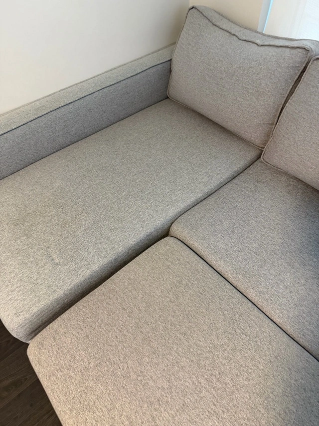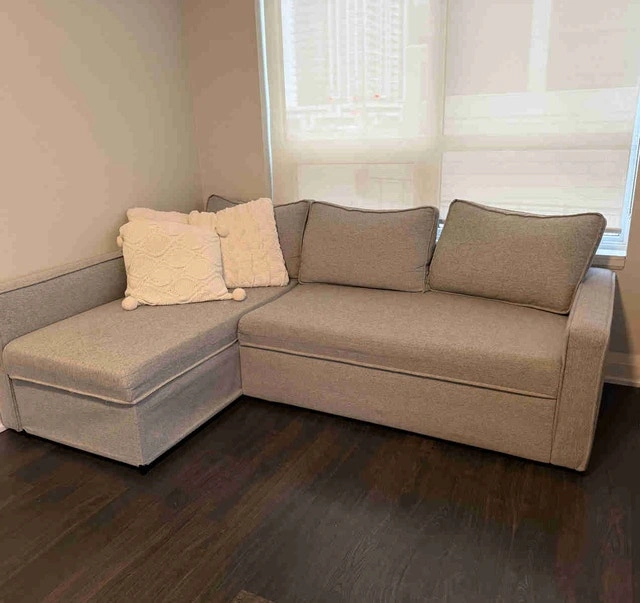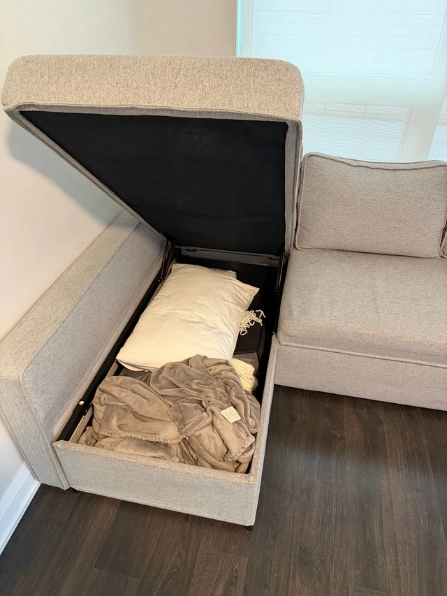 Refresh your living room with this versatile sectional that does double duty. By day it’s a comfy corner sofa that seats three-plus; by night the pull-out platform turns it into a guest-ready bed. The chaise lifts to reveal a deep storage box—ideal for stowing extra duvets, pillows or board-game night supplies. All three back cushions have zip-off, machine-washable covers for easy cleaning. Reason for selling: we need a much bigger one for a new house. Condition: very good! 8 out of 10.