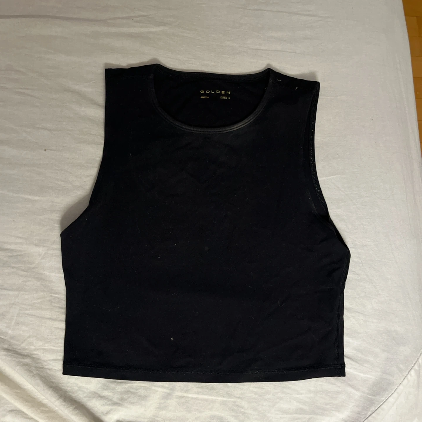 Aritzia Golden black tank top. Size S. Made in Vietnam. Never worn. Just needs a wash since it’s been sitting. Super cute for work, or for going out. Very simple black crop tops