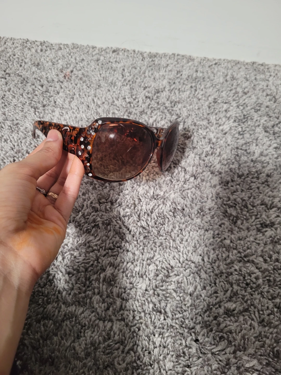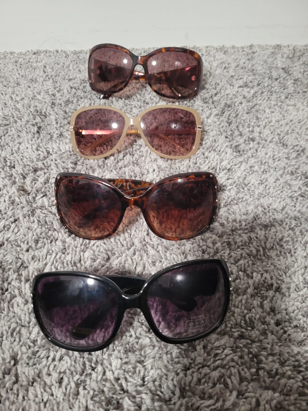 A collection of four pairs of women's sunglasses. Includes styles with tortoise shell frames and decorative accents. Most lenses appear to offer UV protection.