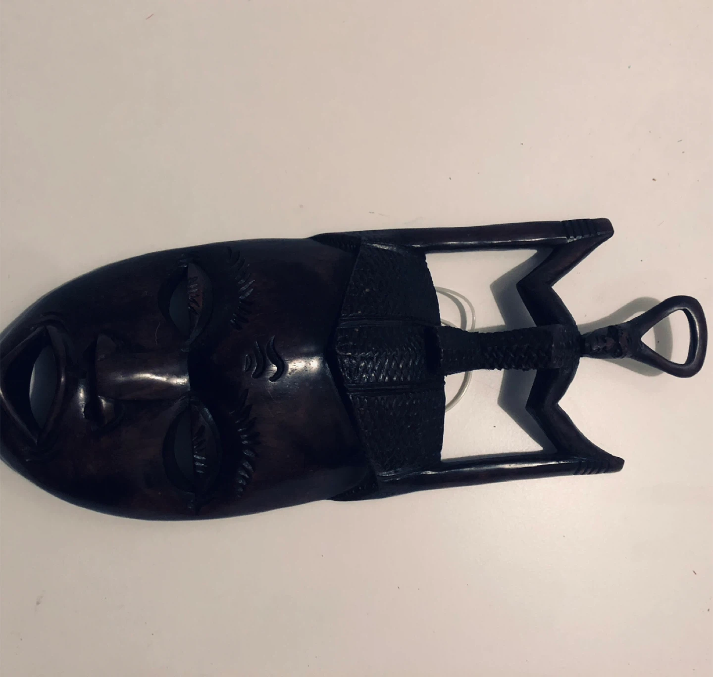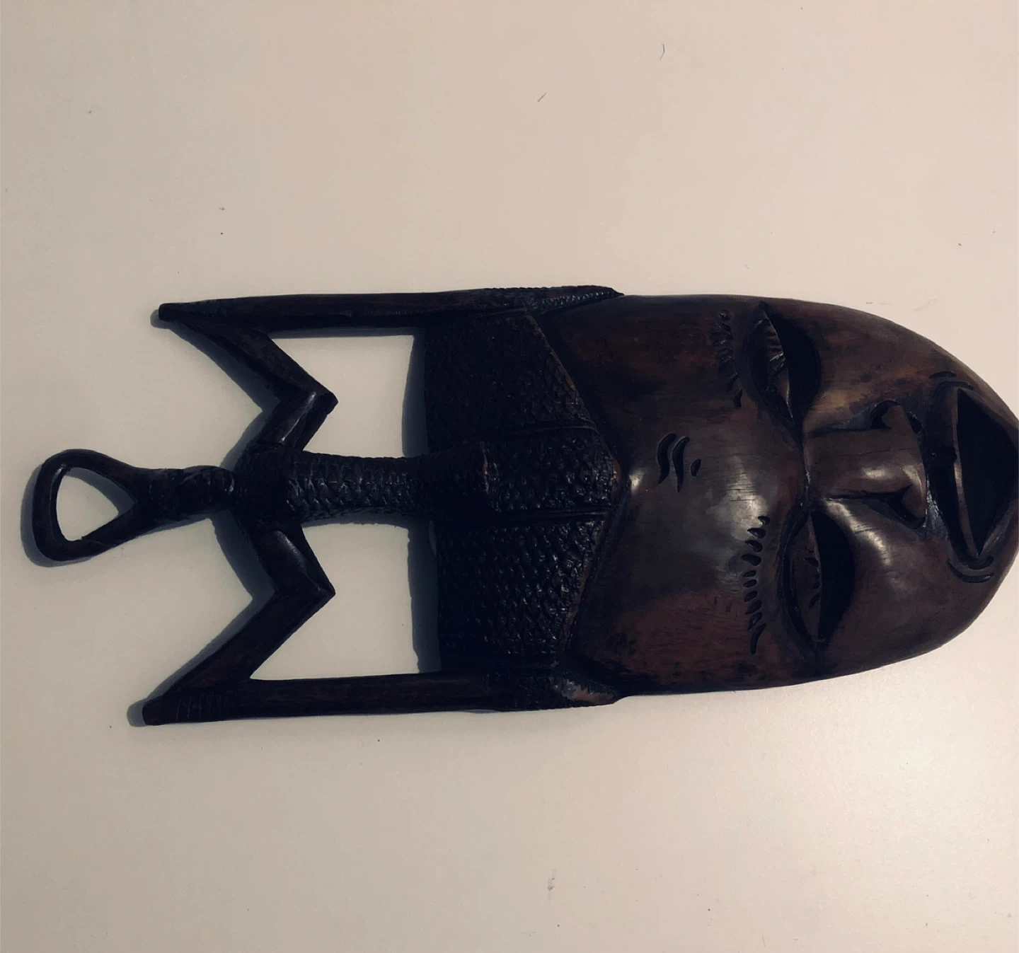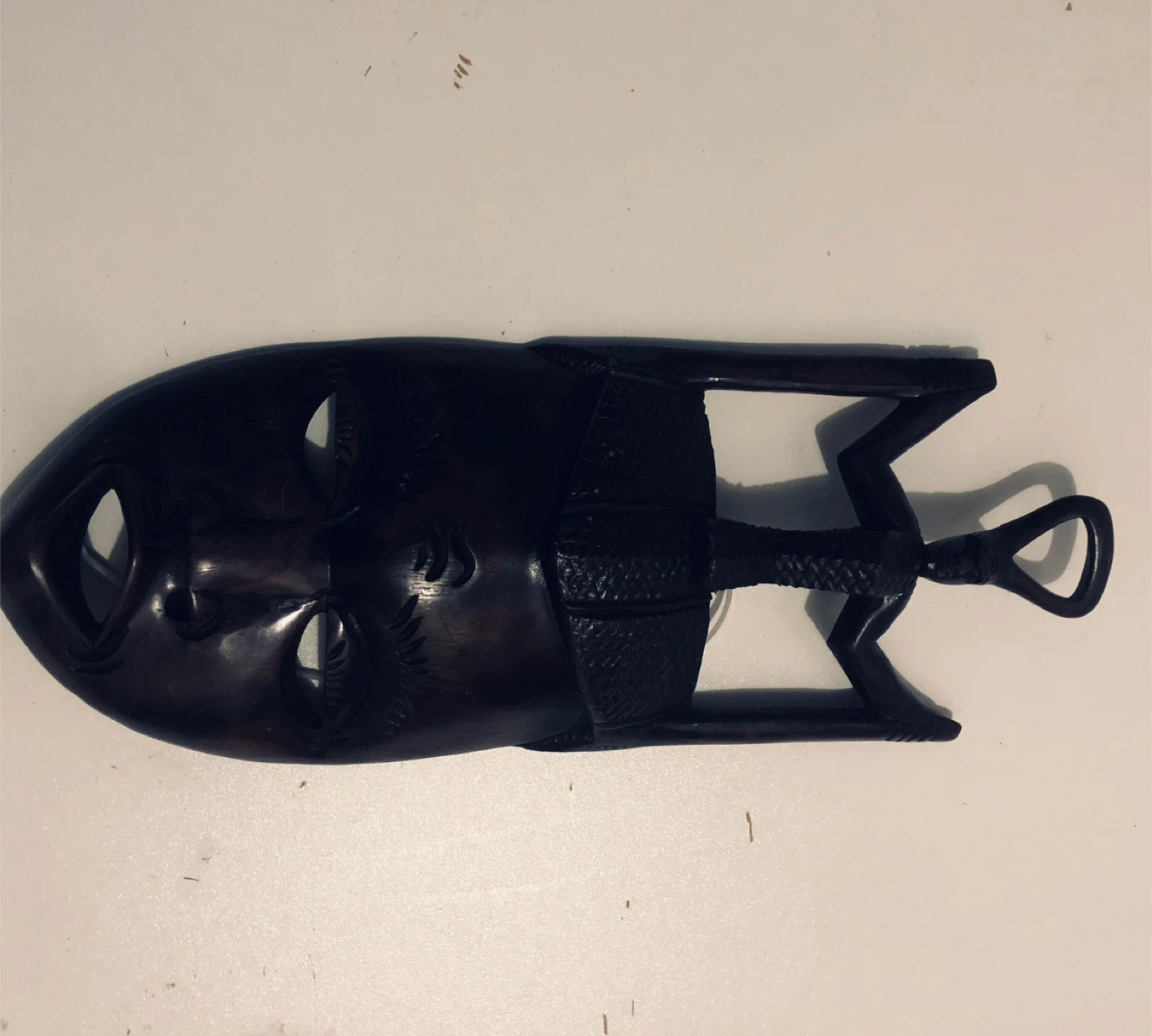 This is a unique hand-carved wooden mask, likely of African origin. It's dark brown and features intricate detailing. It'd make a striking decorative piece for any home.