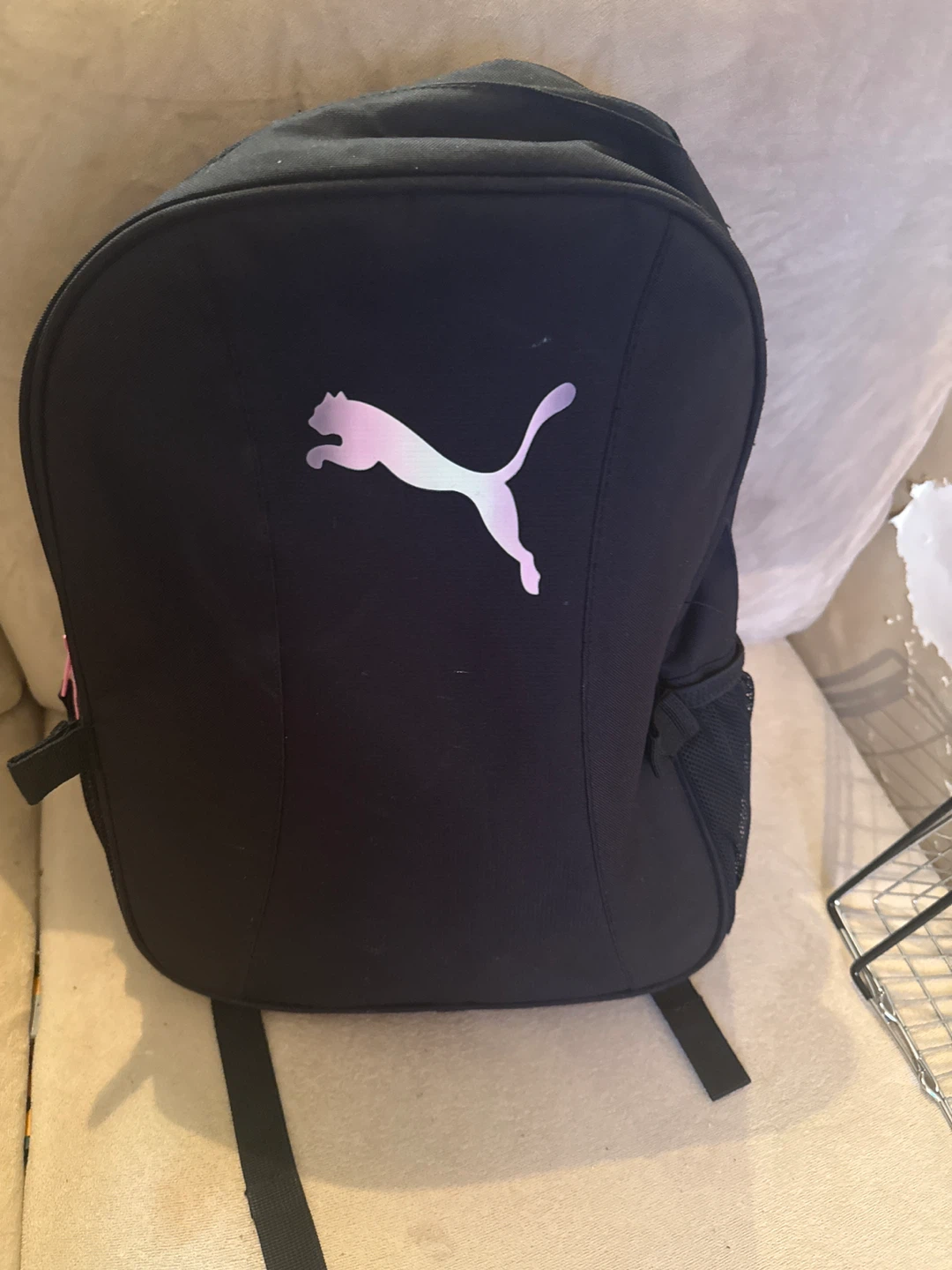This is a black Puma backpack featuring a colourful iridescent Puma logo on the front. It has side mesh pockets. It's a practical size for everyday use or school.
