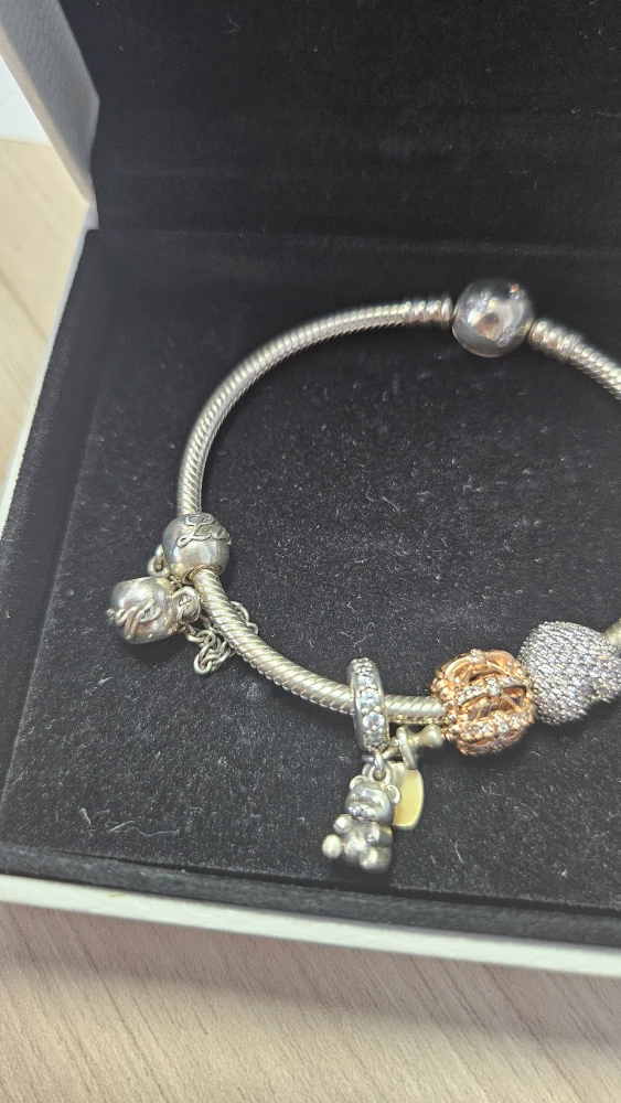 Selling a lovely Pandora charm bracelet that comes with a variety of charms. It's in great condition and comes with the original box. Perfect for adding to your collection or starting a new one!