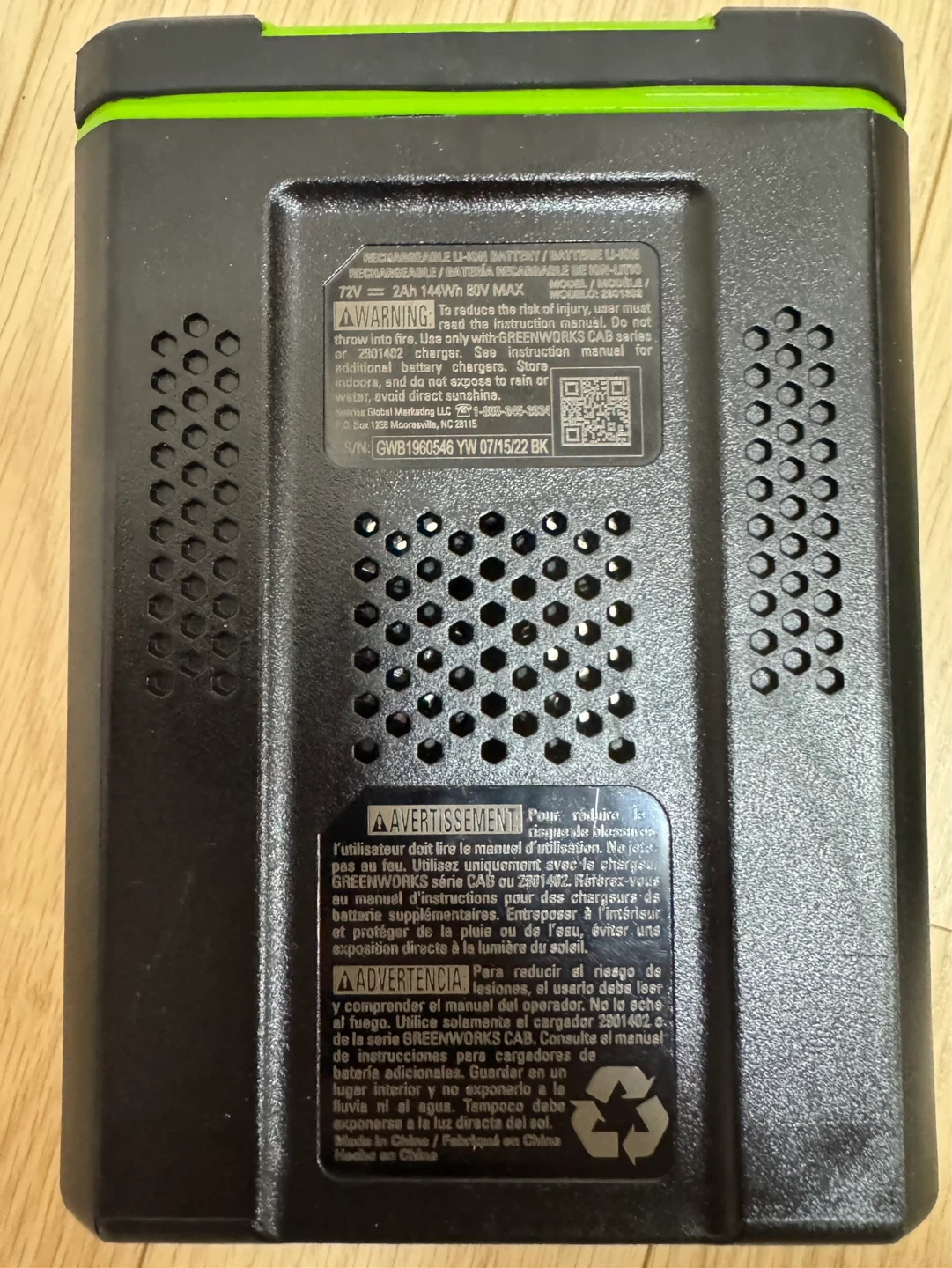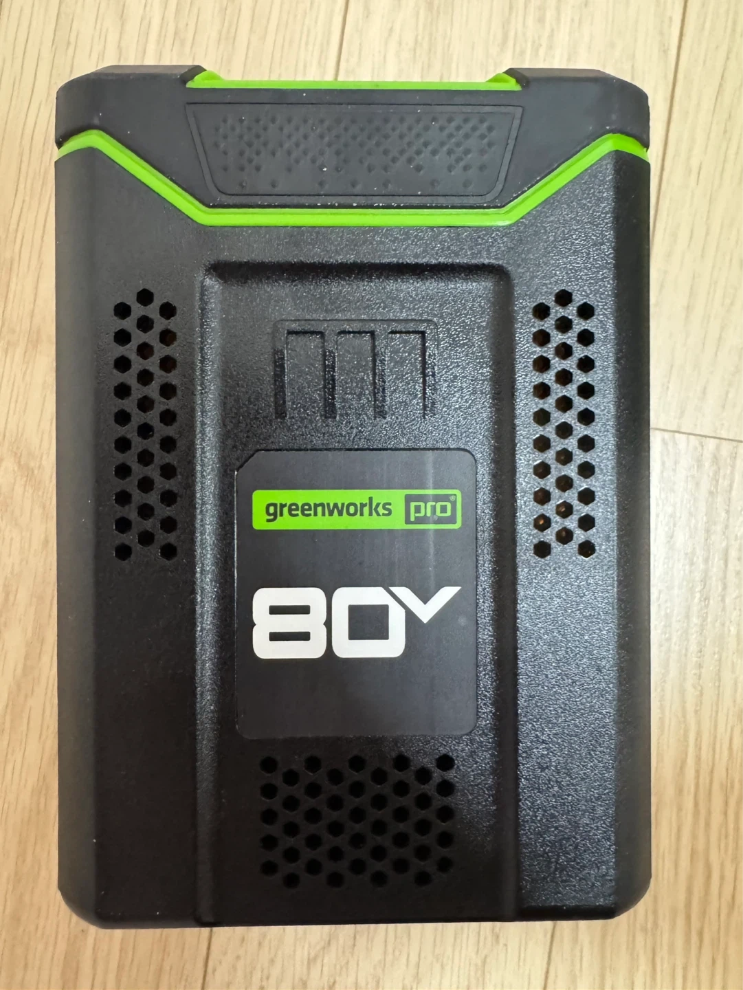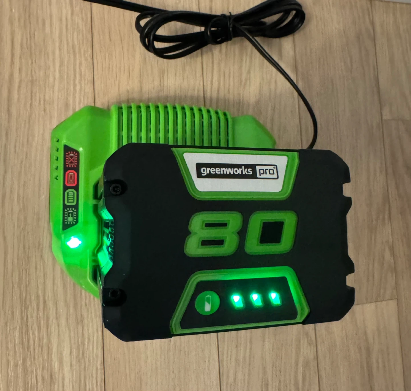 Great Greenworks Pro 80V battery and charger. Battery is 2Ah 144Wh. Both are working, lights on. Good for all your Greenworks 80V tools.