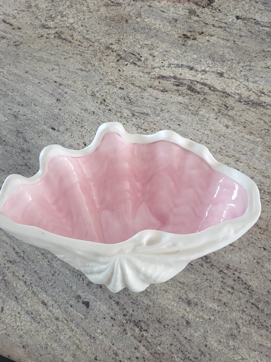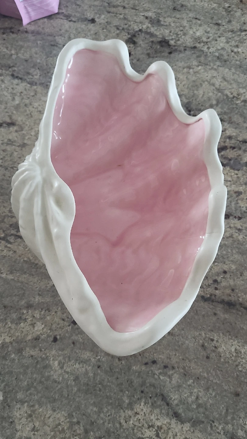 Decorative seashell shaped bowl. Features a glossy pink interior with a marbled effect and a white exterior. It's a lovely accent piece for any room.