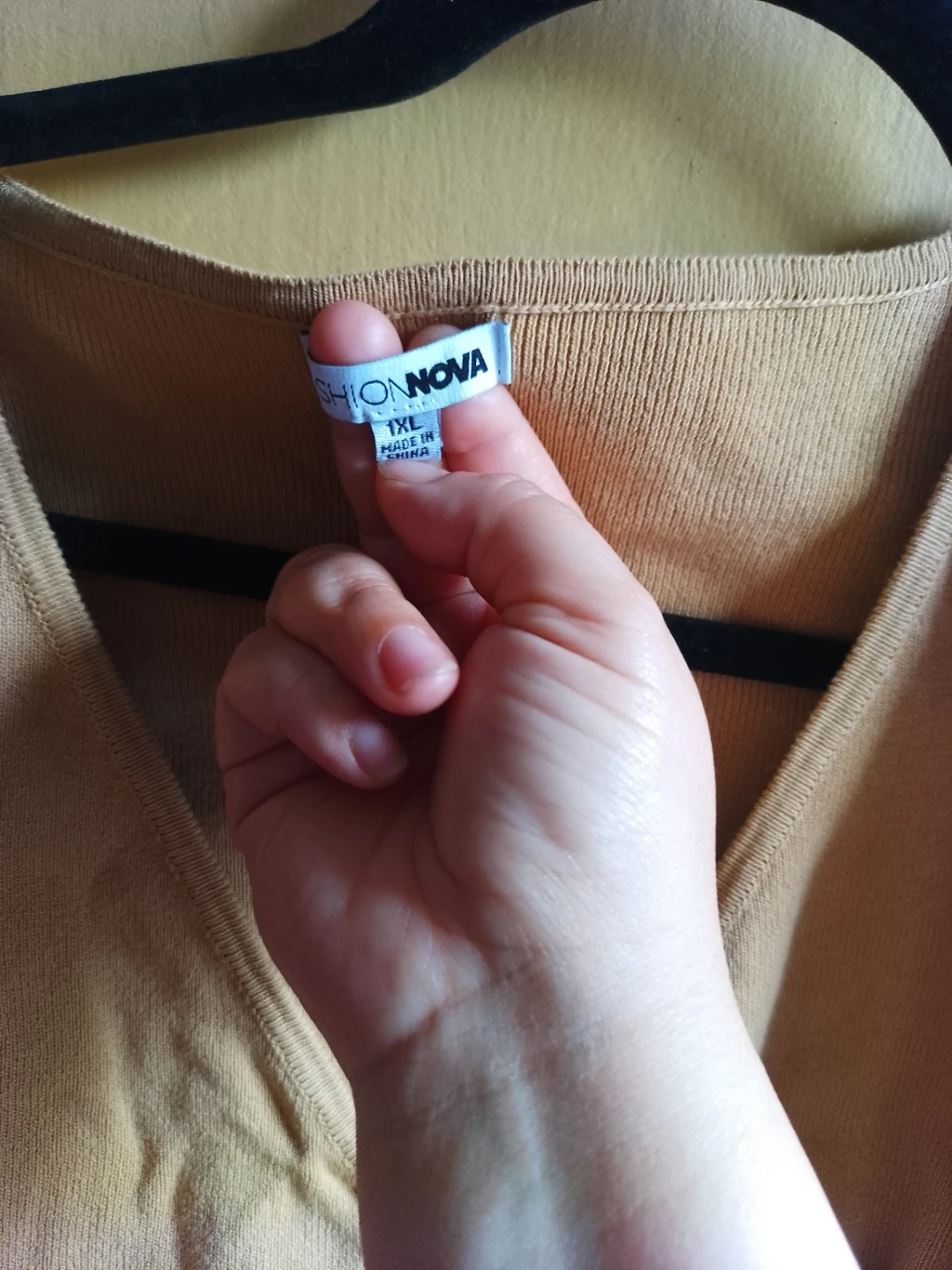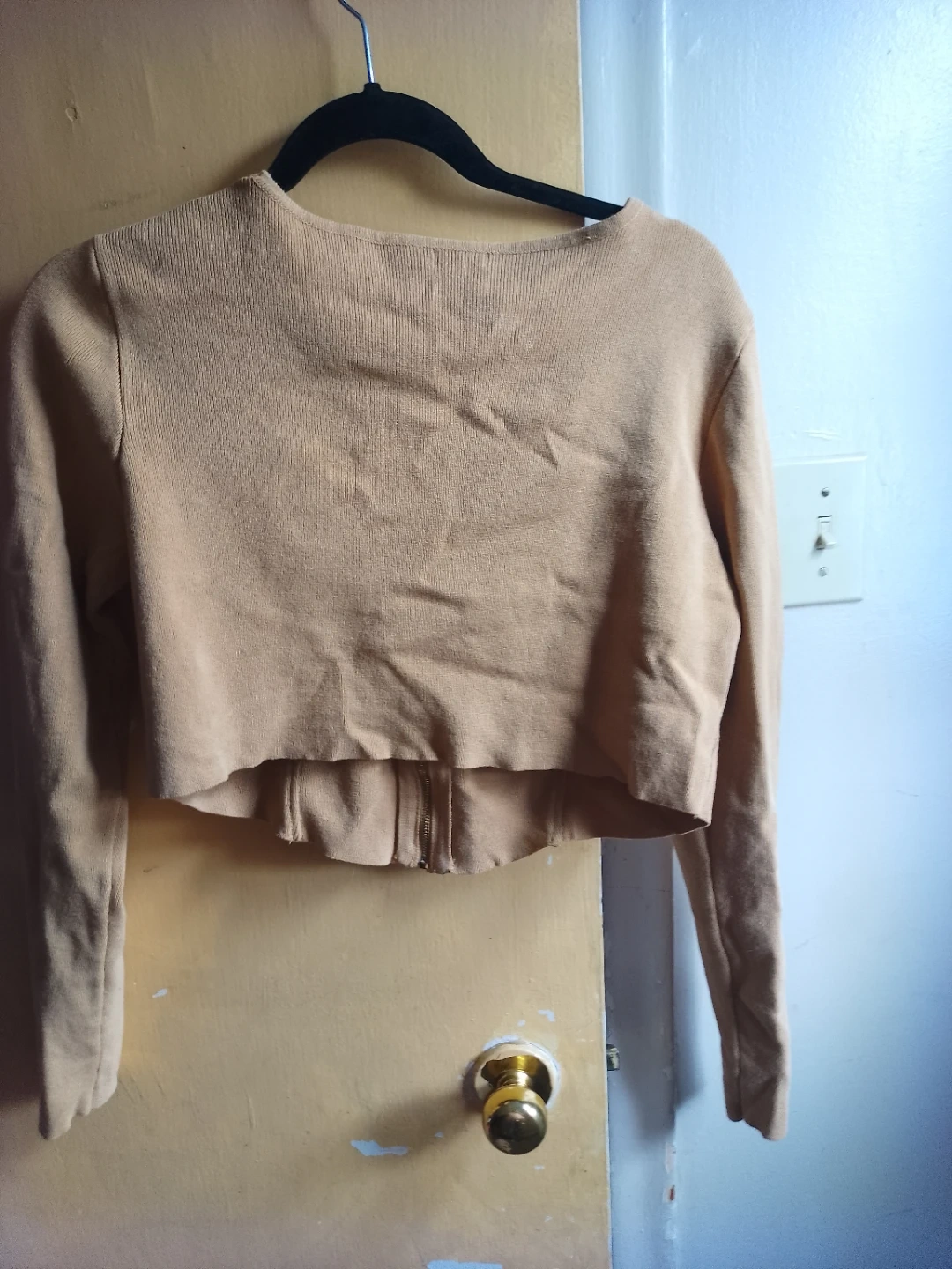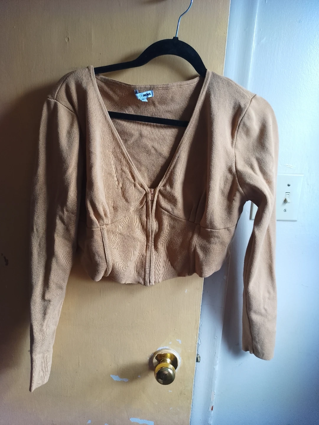 Fashion Nova cropped cardigan sweater. It's a camel colour with a ribbed texture and a zipper closure at the front. Size is 1XL.