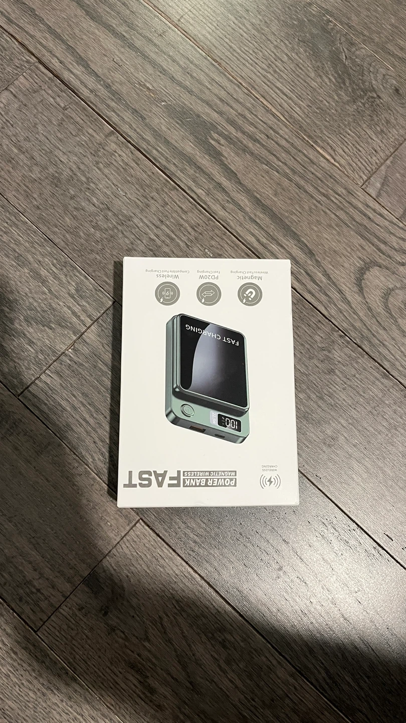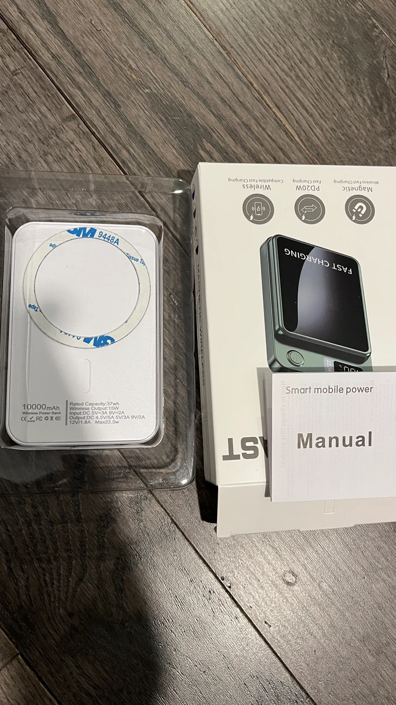 10000mAh capacity power bank with PD 20W wired and wireless fast charging capabilities. It's a magnetic power bank with a digital display. Includes USB cable and manual.