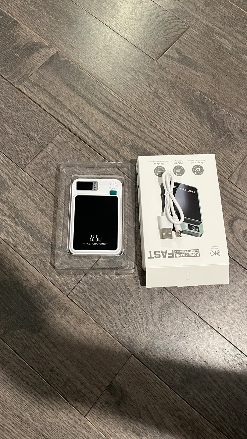 10000mAh capacity power bank with PD 20W wired and wireless fast charging capabilities. It's a magnetic power bank with a digital display. Includes USB cable and manual.