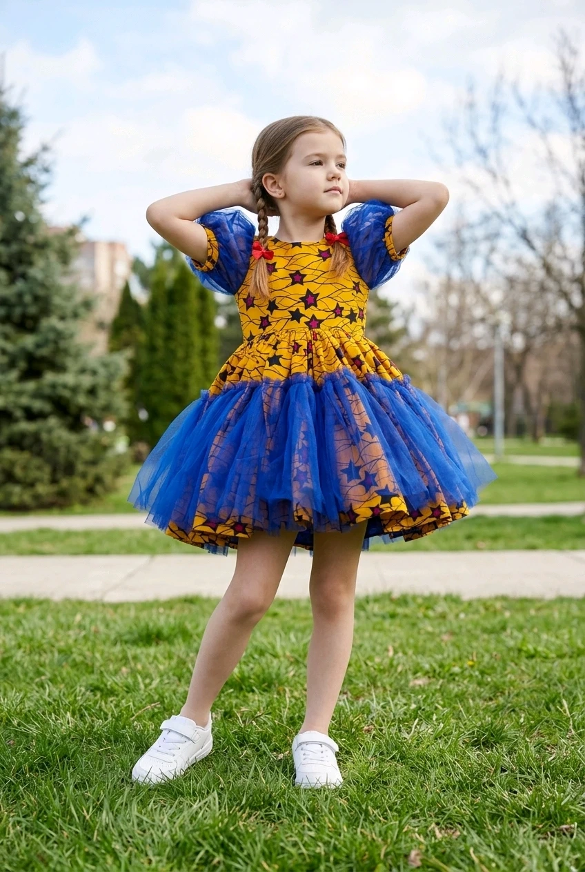 This adorable dress features a yellow bodice with a star print and puff sleeves. It has a full, blue tulle skirt for a fun, festive look. It's perfect for parties or special occasions!