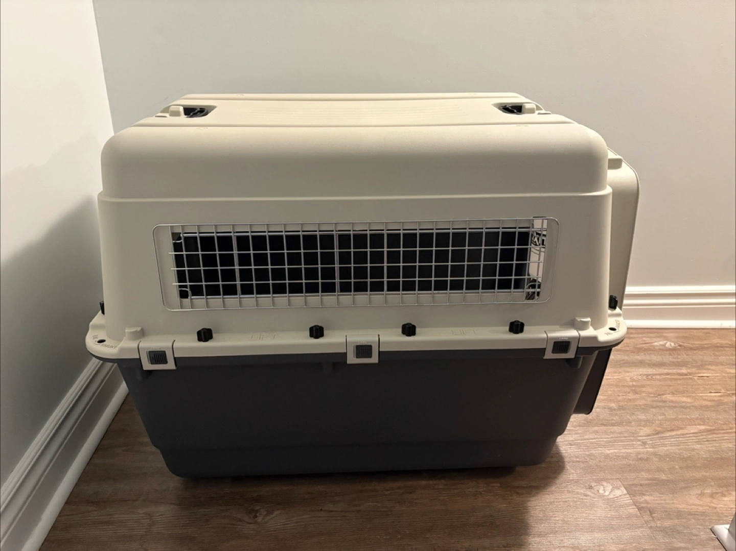 32” pet carrier in mint condition, never used. Fits dogs up to 50lbs. Dimensions 32x24x26”. Plastic carrier with metal door and water dispenser. Comes with wheels and travel bolts.