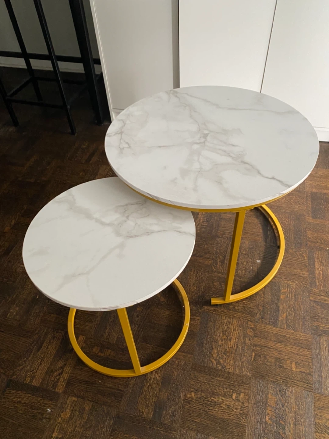 Stylish set of two round nesting coffee tables. Features a faux marble top with gold metal legs. Smaller table tucks neatly under the larger one for space-saving. These tables are great for adding a decorative touch to your living space!