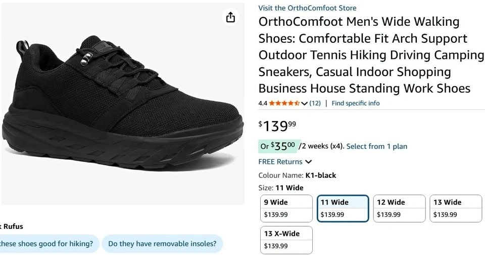 OrthoComfoot Shoes Snickers 11.5 Black Wide with extra insoles