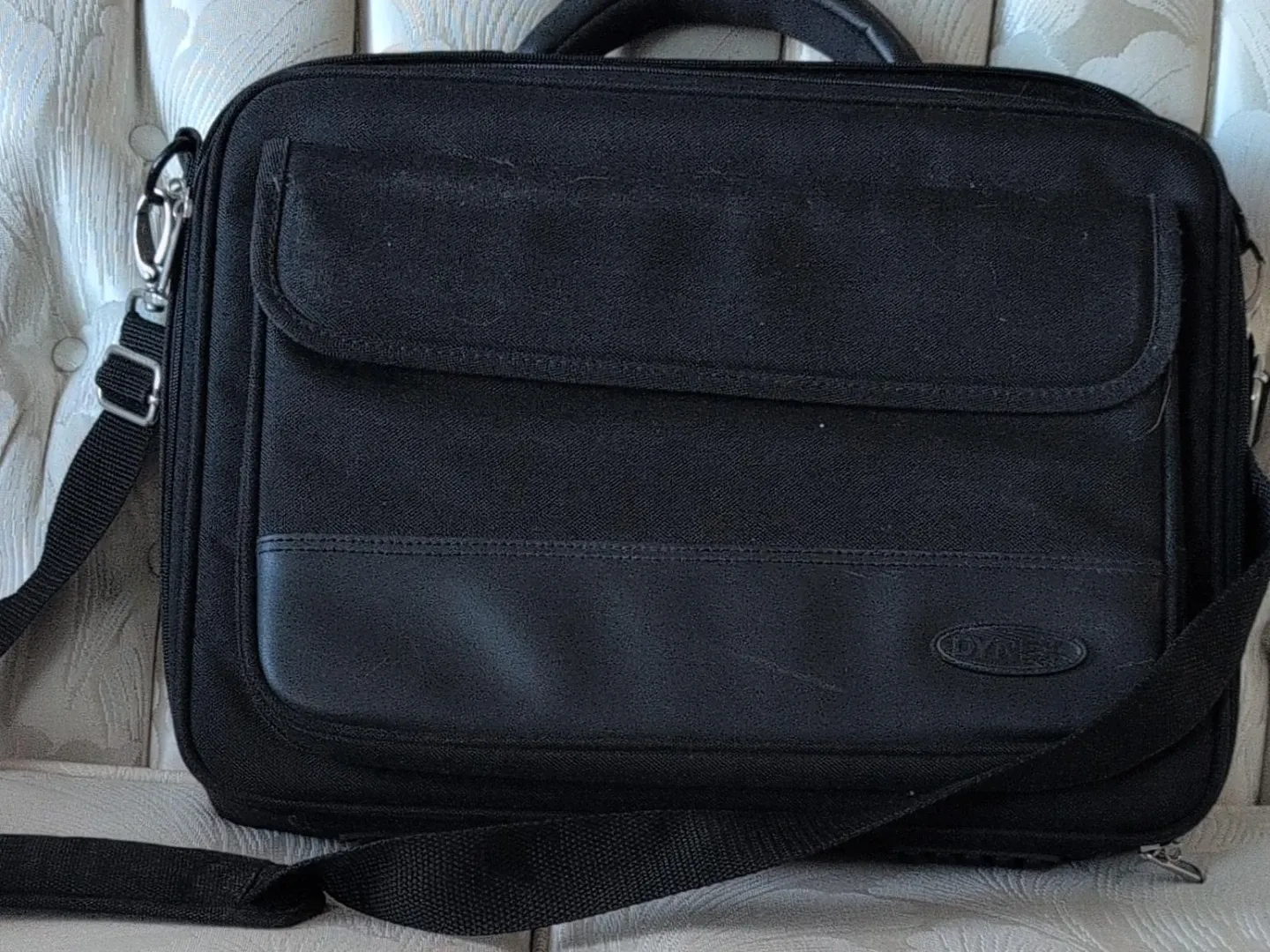 This is a black Dynex laptop bag. It's made of durable fabric with a faux leather accent. Includes a detachable shoulder strap.