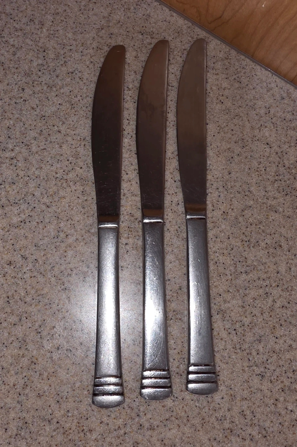 Stainless steel flatware pattern design. The pattern is known for its glossy finish and sleek, modern design. It was produced by Cambridge Silver from approximately 1996 to 2018. The dinner knife typically measures around 8.5 inches in length. These are on the slightly heavy side.