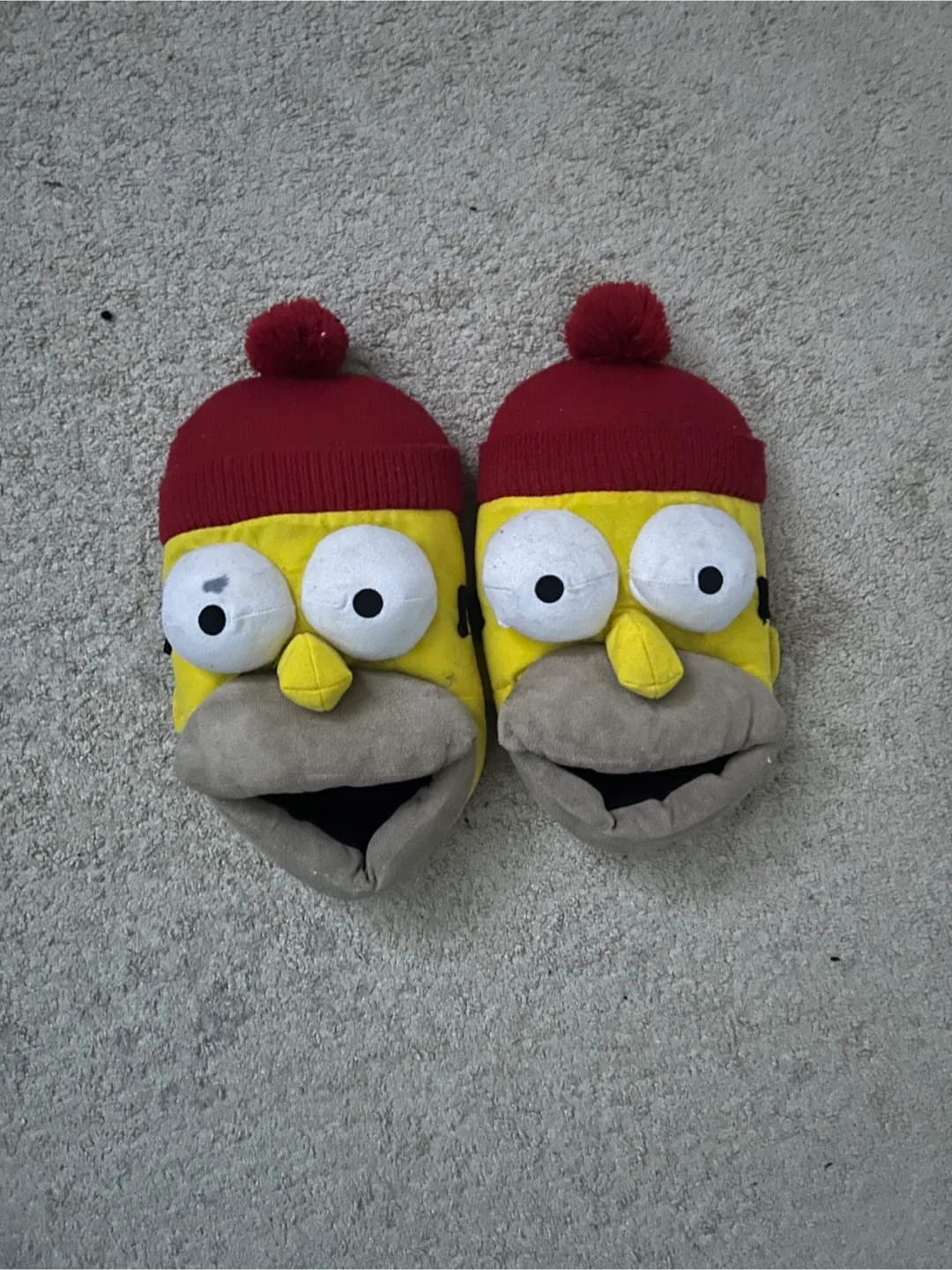 These fun slippers feature Homer Simpson's face with a red knit hat and pom-pom. They have non-slip soles for safety. Perfect for keeping your feet cozy at home!