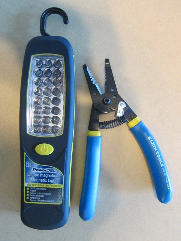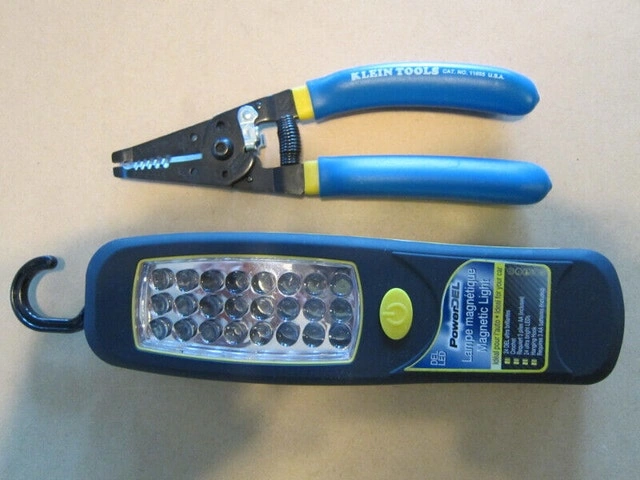 For sale are brand new Klein Tools Wire Stripper and brand new Magnetic Light with 24 ultra bright LED. The Wire Stripper's price is $35. It has precision shear-type blades for clean cuts on solid and stranded copper wire; easy-to-read markings on both sides. Curved handles help reach into confined areas, with wire looping and bending holes. A coil spring provides fast self-opening action. It also features a strong-gripping serrated nose for easy bending, shaping, and pulling of wire, plus screw-shearing holes. The Magnetic Light's price is $15. It has 24 ultra bright LEDs, a magnet, and a hook, which is ideal for car repairs.