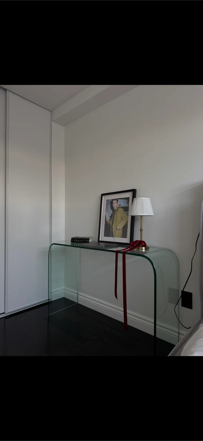 A sleek console table with a modern curved design. It's made entirely of clear glass. This table is a great accent piece for entryways or living rooms.