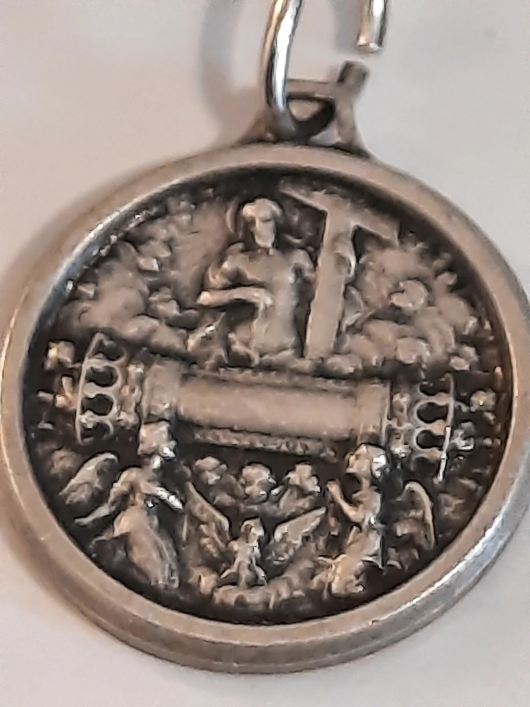 A double-sided religious medal pendant. One side features Jesus Christ wearing a crown of thorns, and the other depicts Christ rising from a tomb with angels. Made of metal.silver filled.