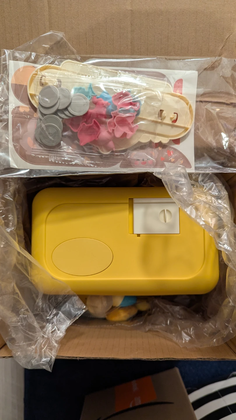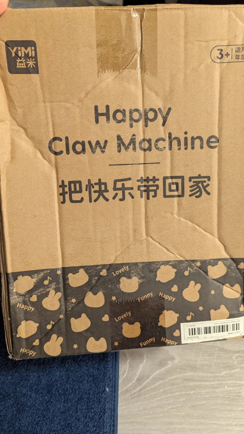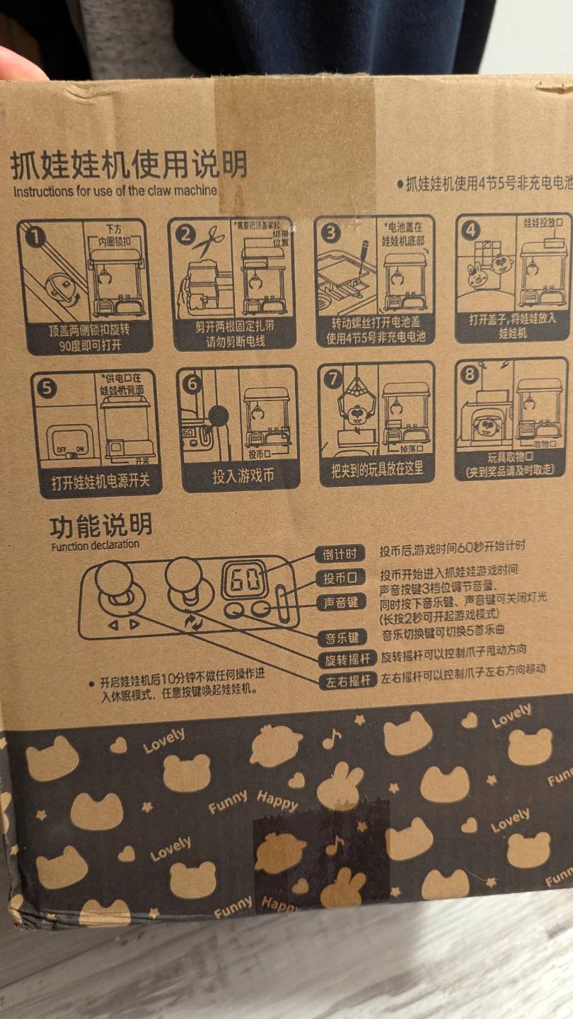 Fun claw machine for hours of entertainment in your own home. It runs on 4 AA batteries. Includes a sticker sheet, plastic coins, and some small plastic toy prizes.