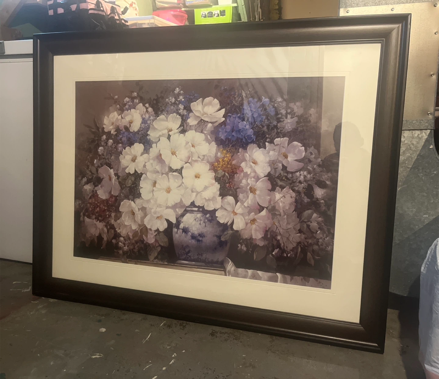 Large print featuring an arrangement of white and blue flowers in a vase. Dimensions of the frame are approximately 45” by 34”.
