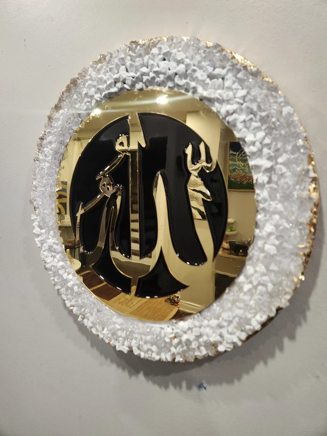 This unique piece features a gold-tone mirror centre with black Arabic calligraphy. It's surrounded by a textured border of white crystals and gold accents. It's a striking addition to any home decor! with LED lights.