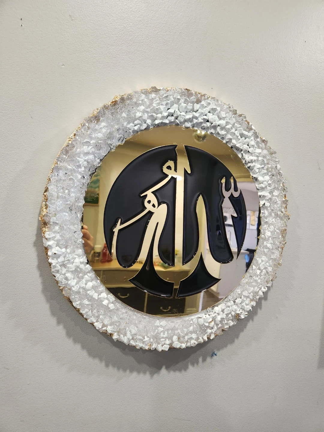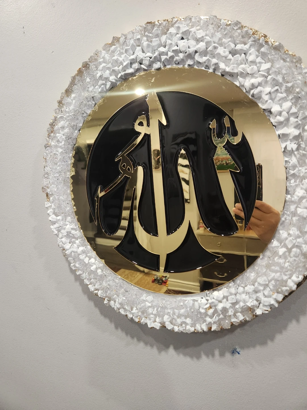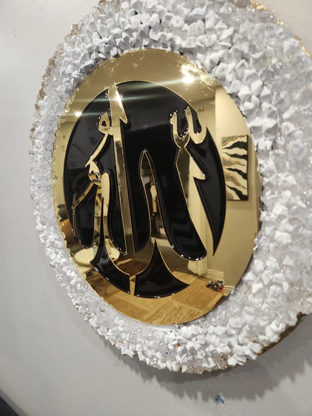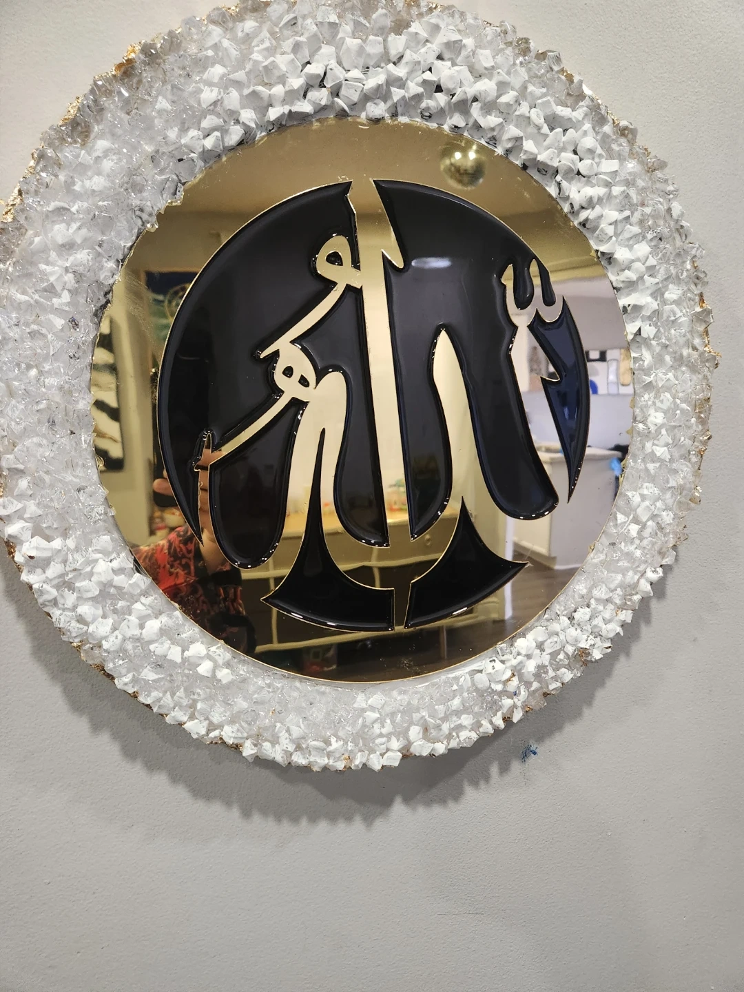 This unique piece features a gold-tone mirror centre with black Arabic calligraphy. It's surrounded by a textured border of white crystals and gold accents. It's a striking addition to any home decor! with LED lights.