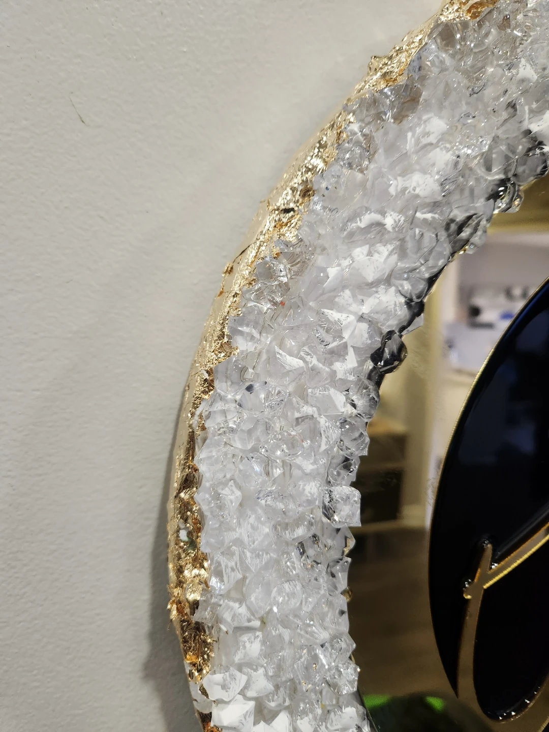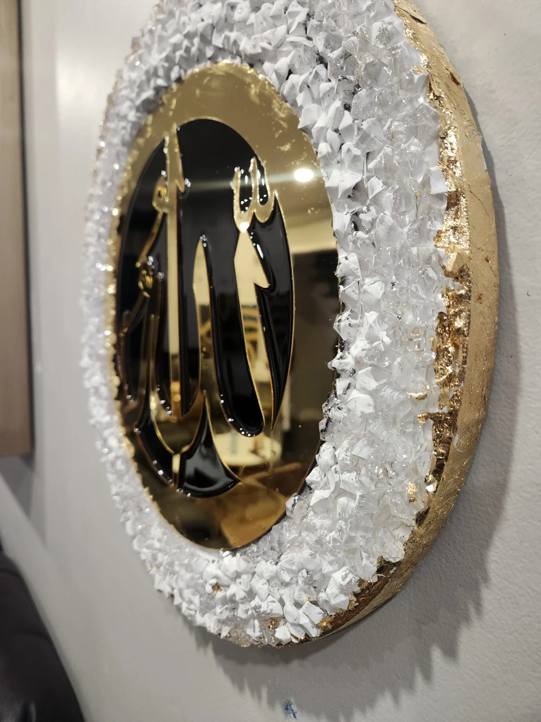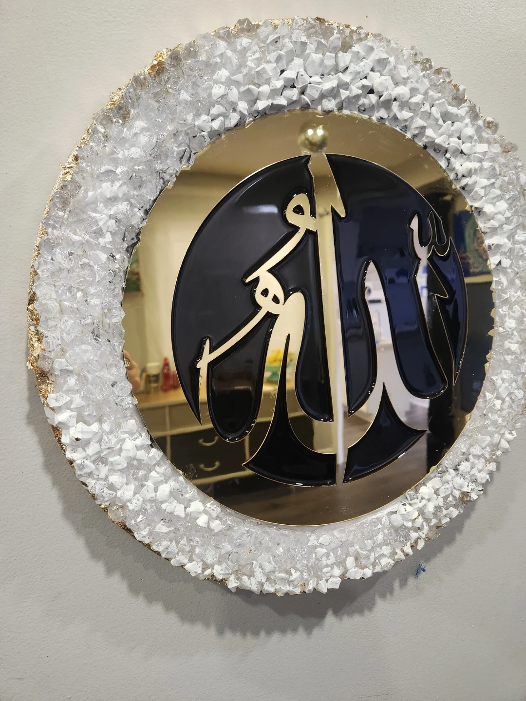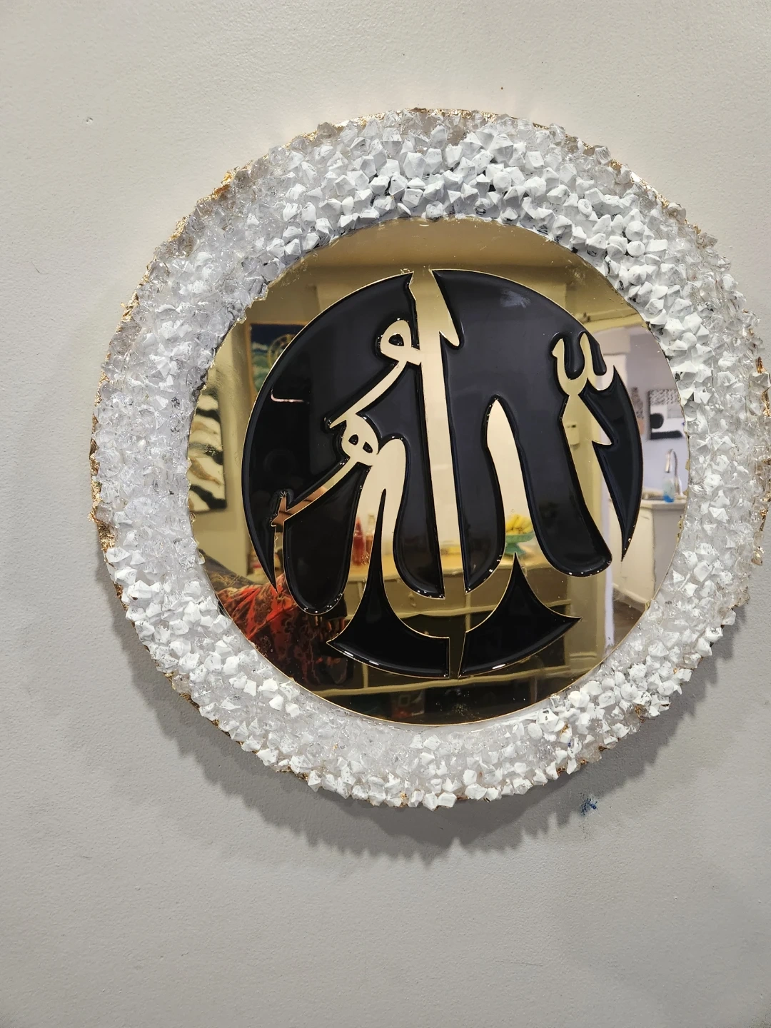 This unique piece features a gold-tone mirror centre with black Arabic calligraphy. It's surrounded by a textured border of white crystals and gold accents. It's a striking addition to any home decor! with LED lights.