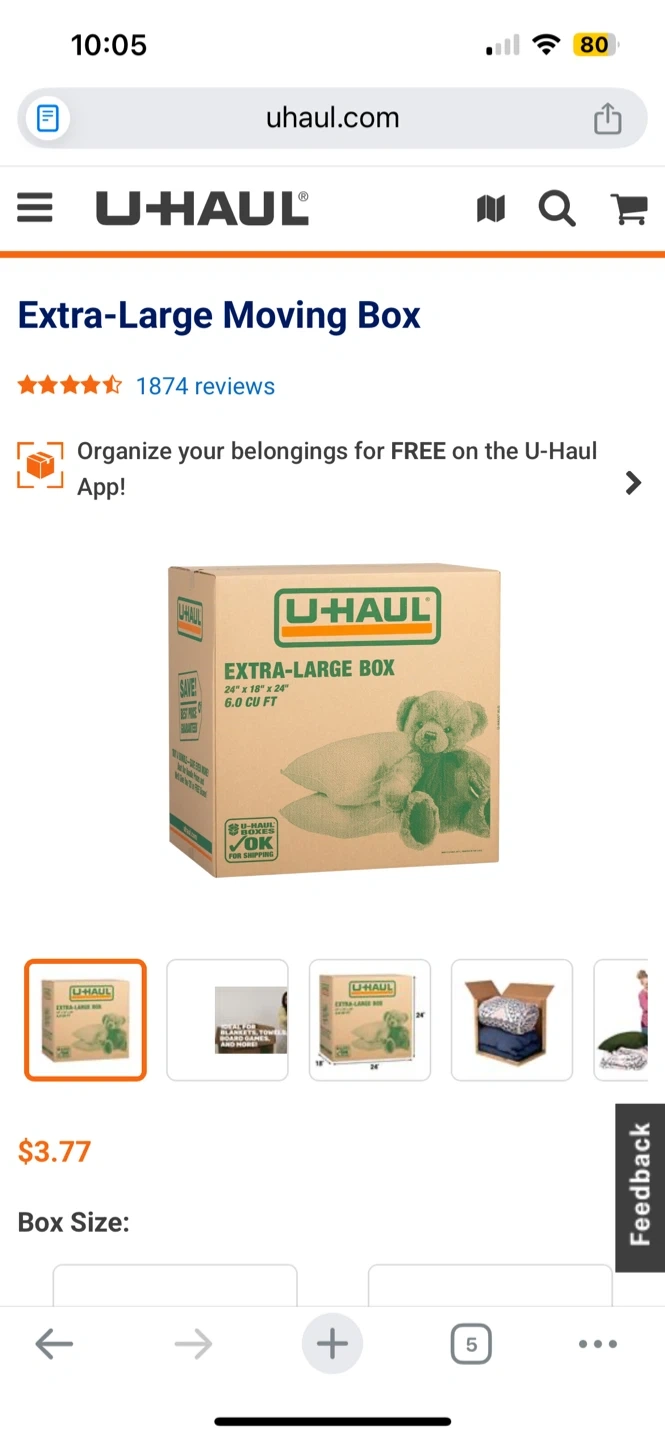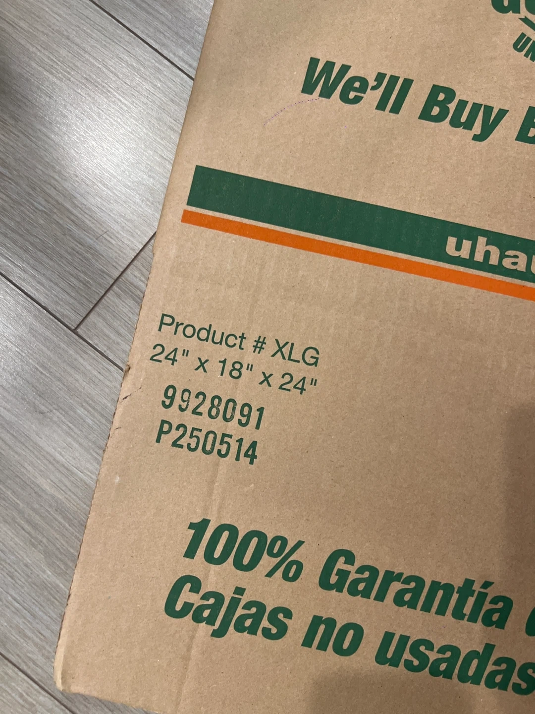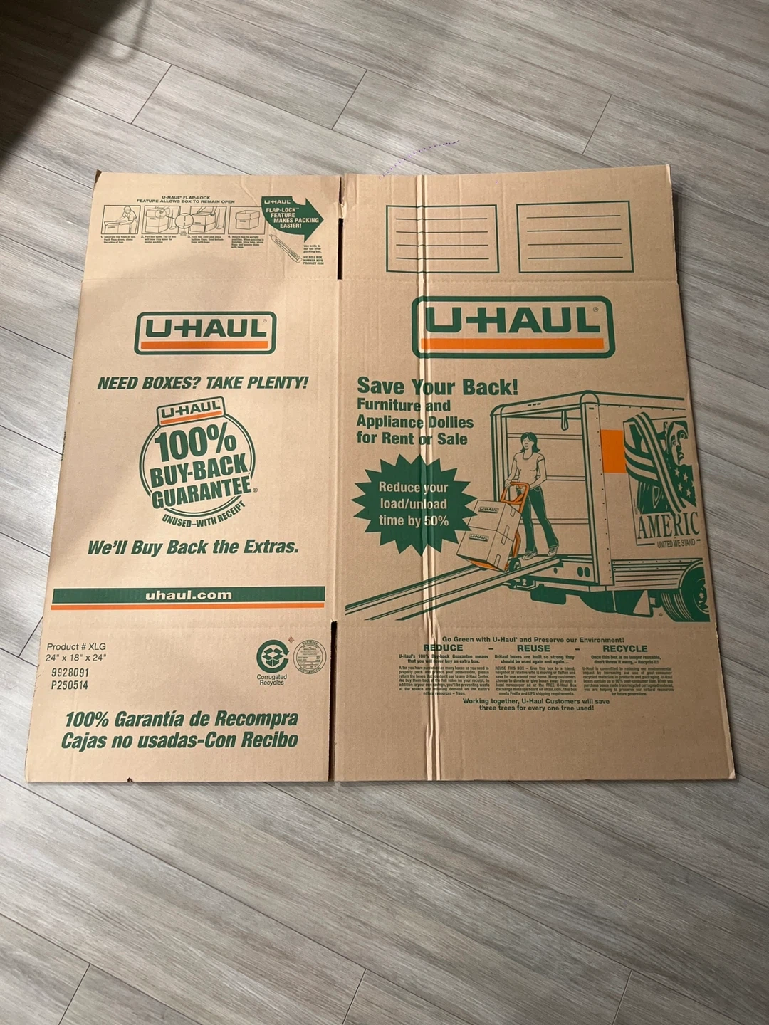 This is a U-Haul extra-large moving box. It measures 24 inches by 18 inches by 24 inches. It's ideal for packing larger items and can be used for storage.
