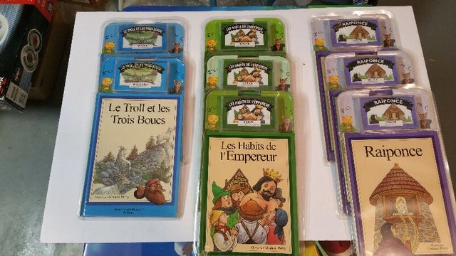Up for sale we have a lot of 8 Brand new Children’s Assorted French Fairytale Story books with Cassette. This lot consist of 3 different titles, 3x Les habits de l’Empereur (The clothes of the Emperor) , 2x Le Troll et les Trois Boucs (The Troll and the Three Billy goats), and 3x Raiponce . Books are all illustrated by Graham Percy and are made in Spain. All are new Asking $20.00 for all 8 sets. if interested please contact Michel at 613-709-3013 thank you