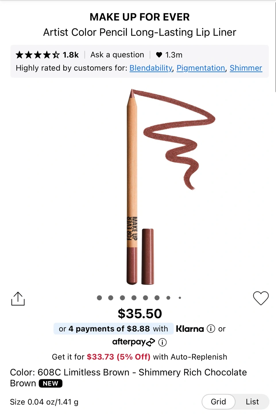MAKE UP FOR EVER Artist Color Pencil Long-Lasting Lip Liner. Shade is 608C Limitless Brown - Shimmery Rich Chocolate Brown. Net weight is 0.04 oz/1.41 g.