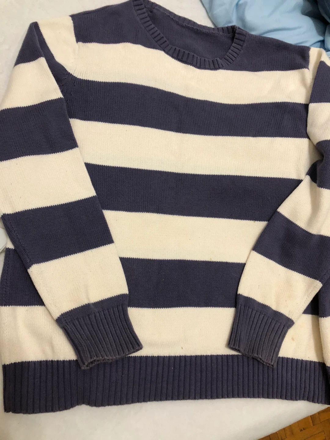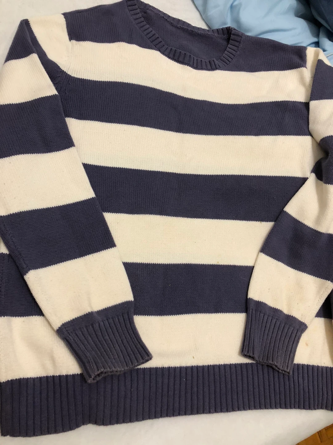 Here's a comfy oversized striped knit sweater! It features a classic design with navy and white stripes. Perfect for adding a touch of nautical style to your wardrobe!