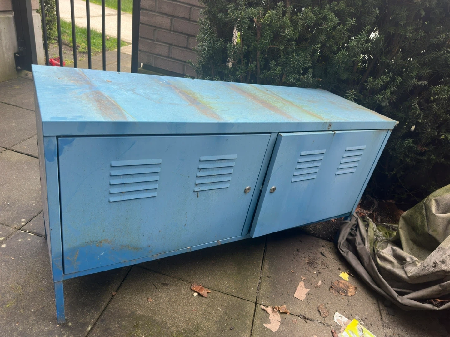 This is a blue metal storage cabinet. It has two doors with vented fronts and small silver handles. The cabinet shows signs of rust and wear. It's a sturdy piece for outdoor or workshop storage. no key