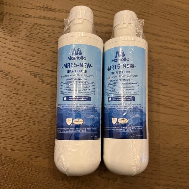 Brand new Marriotto MR15-NEW water filter, compatible with LT1000P/ADQ747935 systems. Ensures your water is clean and fresh. Specifications: Temperature: 33°F-100°F, Working Pressure: 30-100 psi, Flow Rate: 0.528 gallons per minute, Capacity: 200 gallons (757 litres). Priced at $25. If the ad is up, the filter is available!