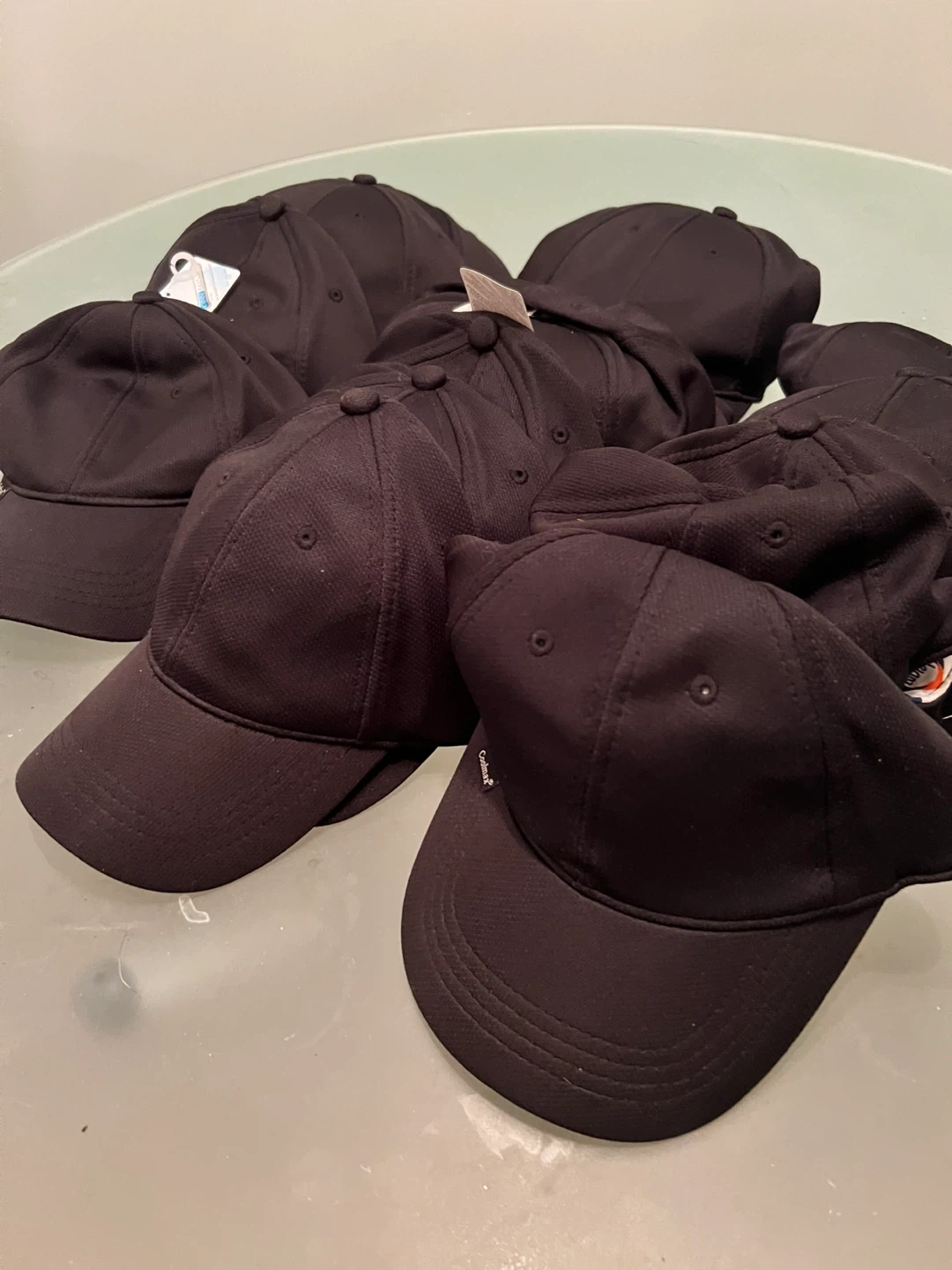 This set includes 18 black baseball caps made with CoolMax Active fabric. It's designed to transport moisture away from your body, keeping you cool and dry. These caps meet INVISTA performance standards for moisture management and breathability. Perfect for active individuals!