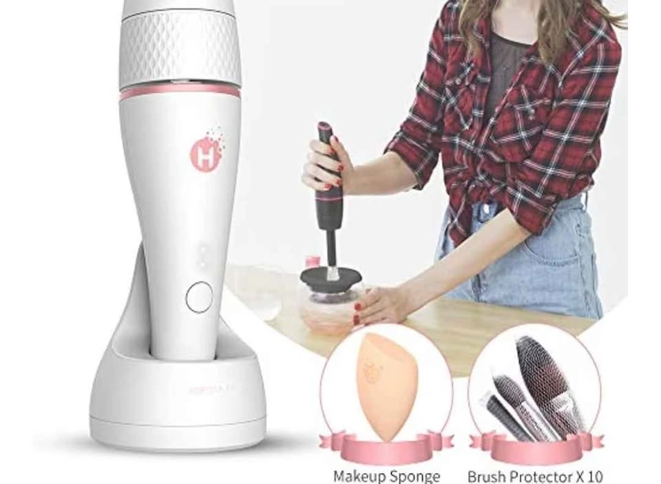 HopeMate Electric Makeup Brush Cleaner and Dryer Spinner Machine. Cleans and dries makeup brushes, removing dust and bacteria. Includes 1 brush holder for all size makeup brushes. White color.