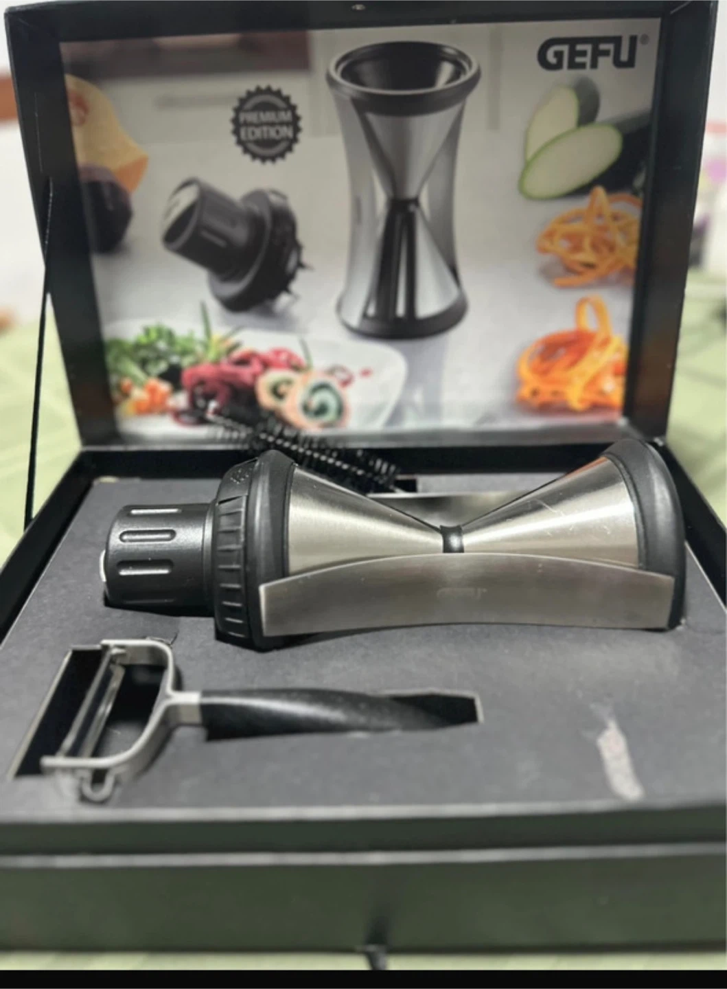 This GEFU Spirelli XL is a premium spiralizer set. It's made of stainless steel and includes a peeler. It's perfect for making vegetable noodles!