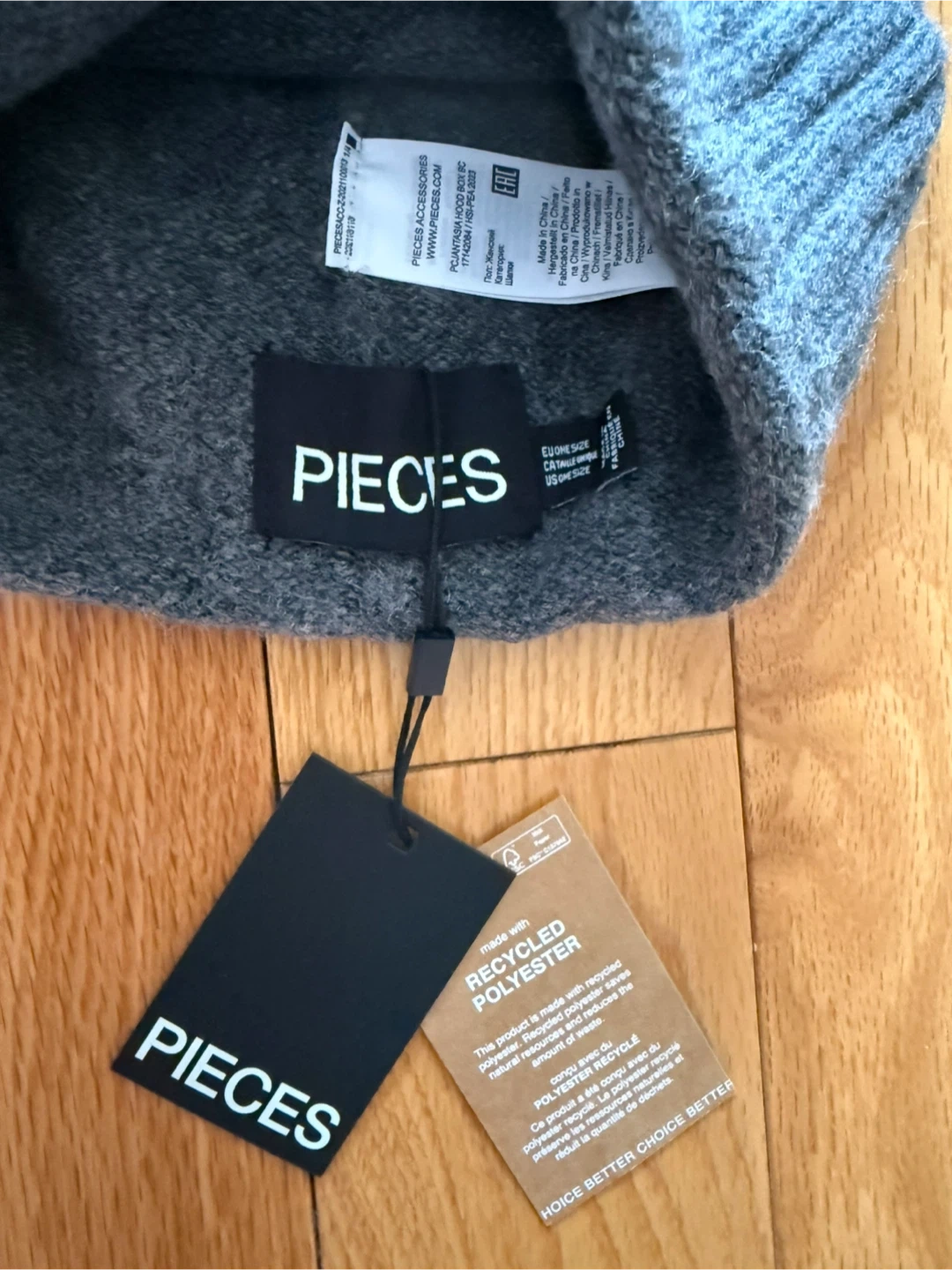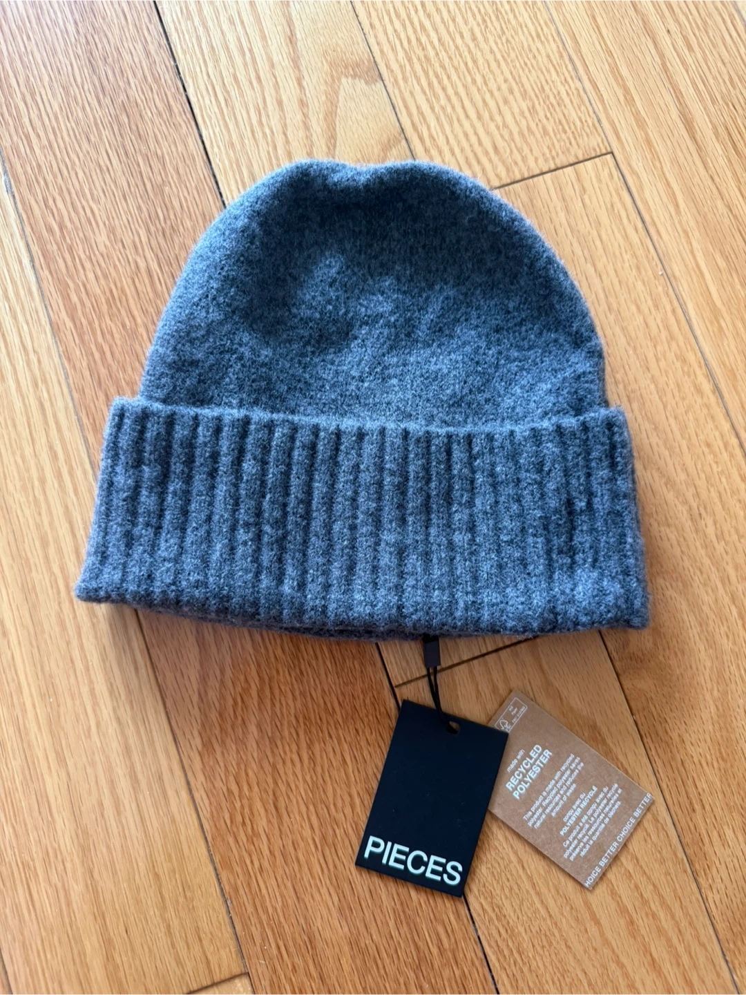 This is a grey beanie from PIECES made with recycled polyester.