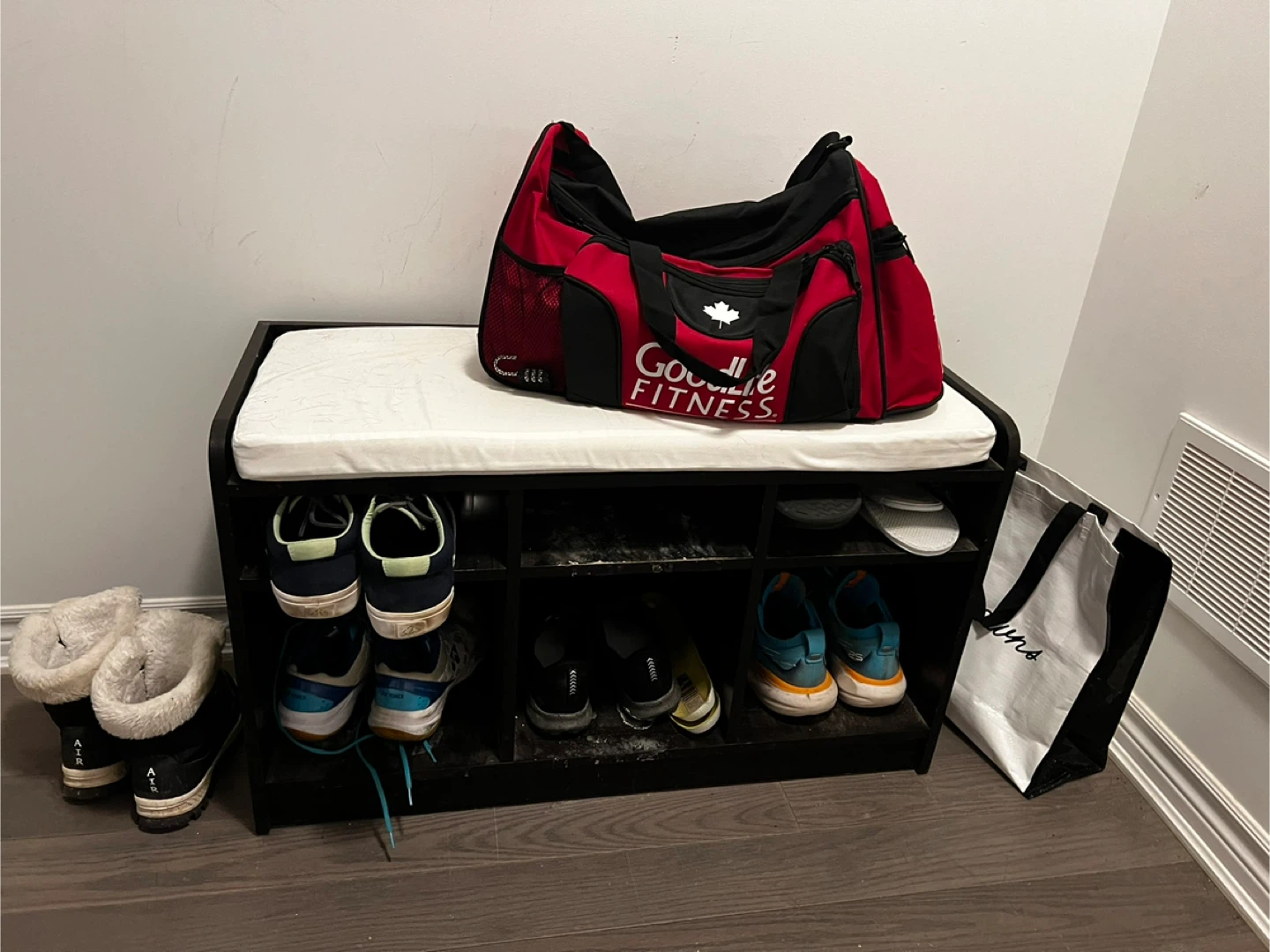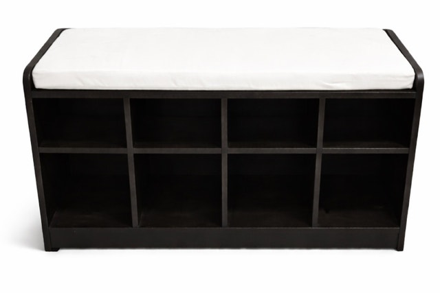 Shoe storage bench with cushioned seat in good used condition. Great for entryway, hallway, mudroom, or closet. Includes multiple cubbies for shoes and small items. Features: Cushioned top seat, Multi-cubby shoe storage, Compact entryway design. Selling due to moving. $40 OBO Pickup in Oakville