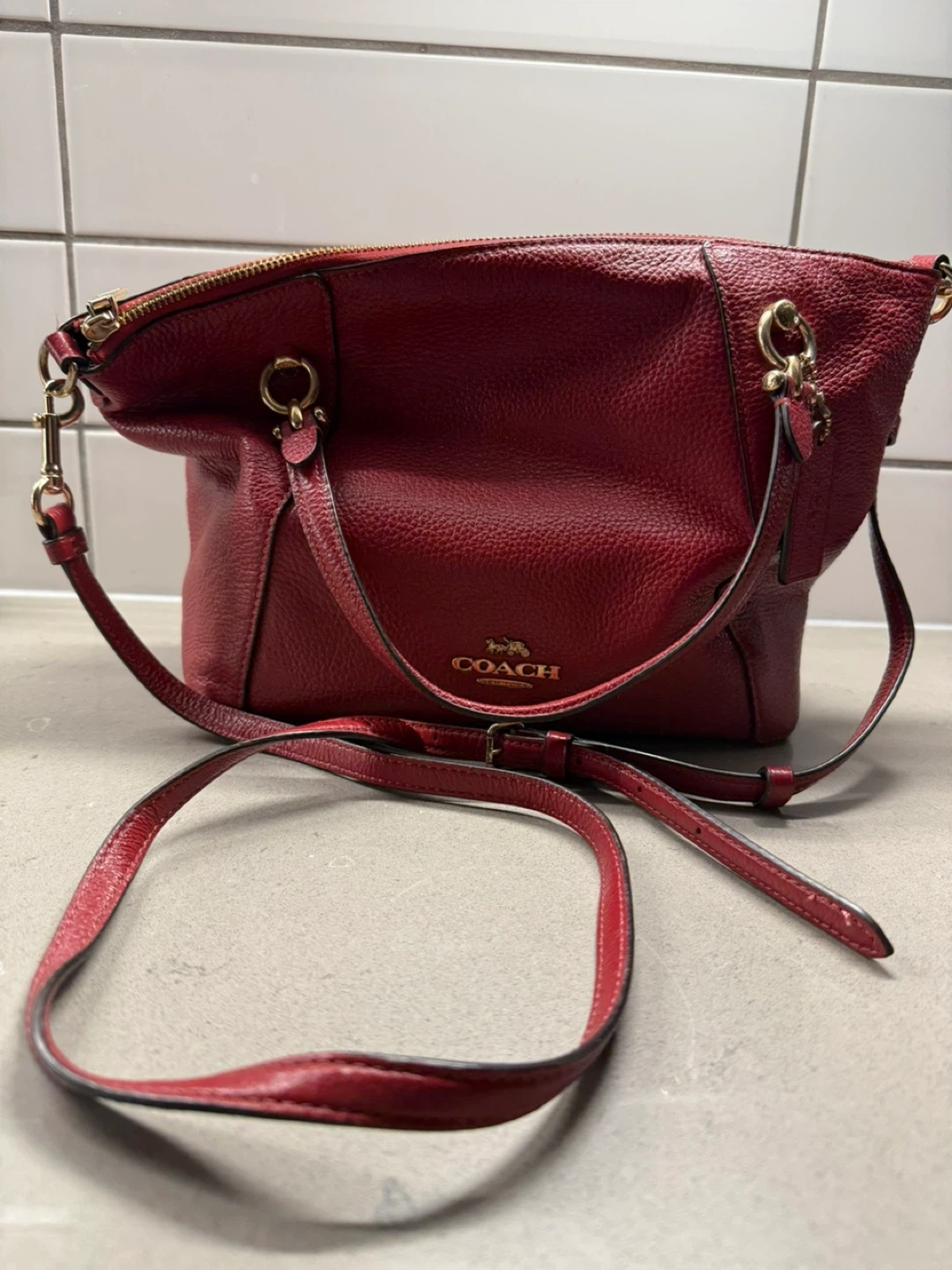 This is a stylish, used Coach satchel in a vibrant red pebbled leather, perfect for adding a pop of colour to any outfit! It has a well-organized interior, and an adjustable strap. The condition is good, with minor signs of wear.