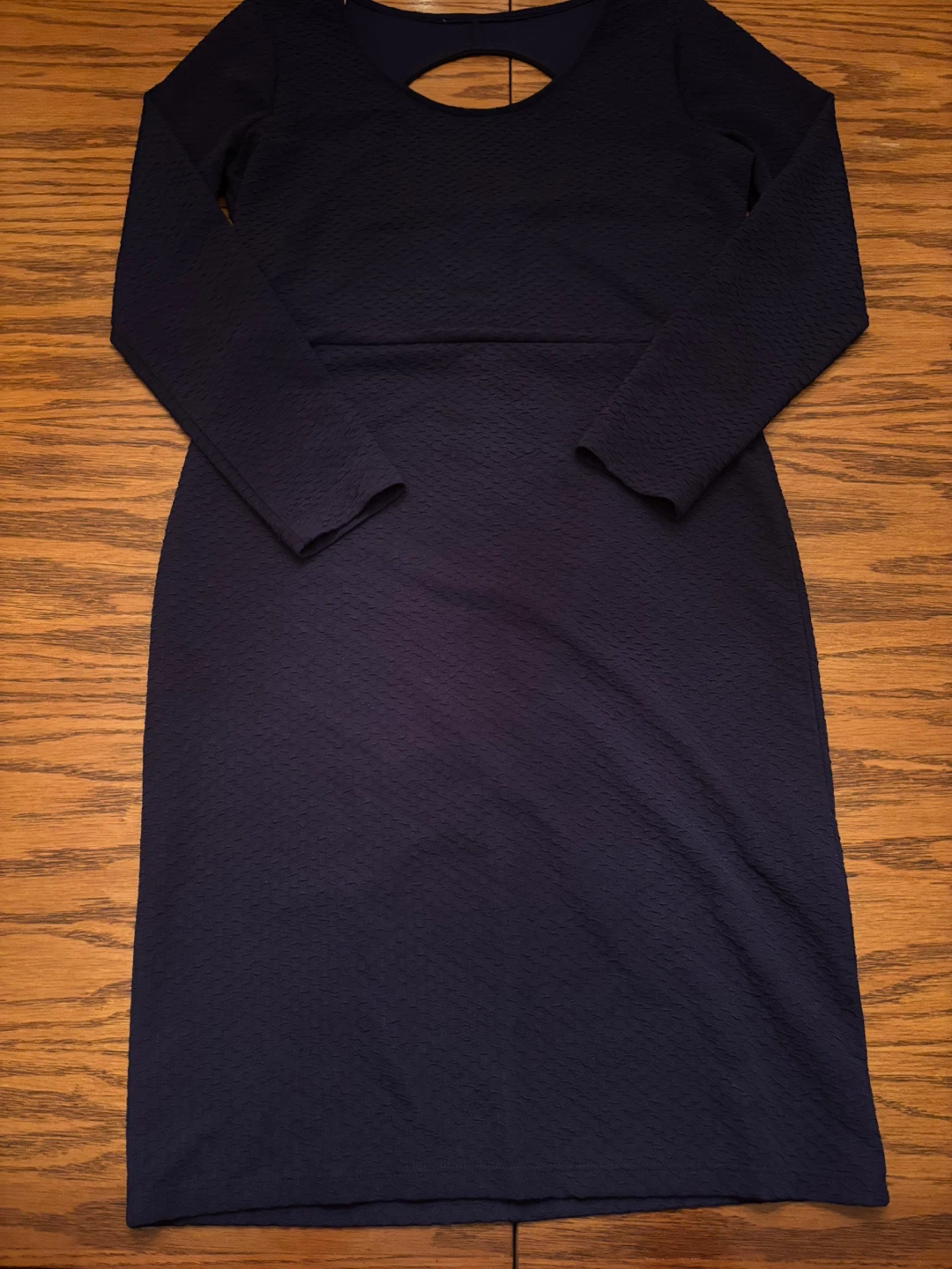 A lovely navy blue dress, perfect for any occasion! The dress features long sleeves. Open upper back.