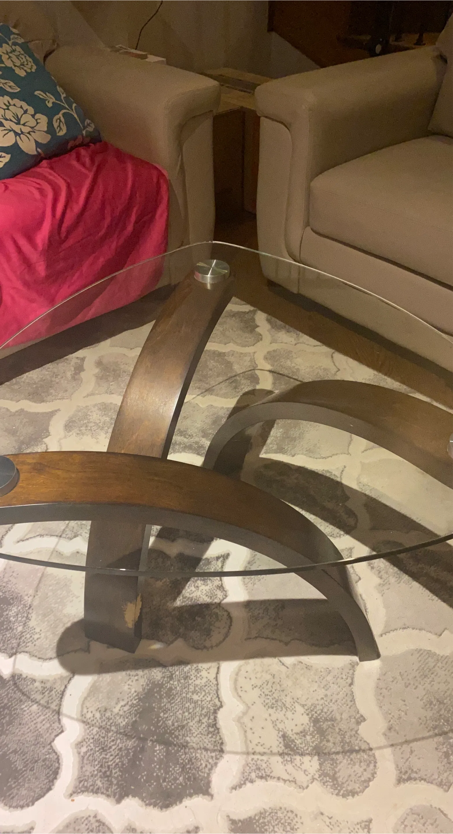 A modern coffee table featuring a clear glass top and a curved wood base. It's a stylish addition to any living room! The wood base has some minor scuffs, visible in photos.