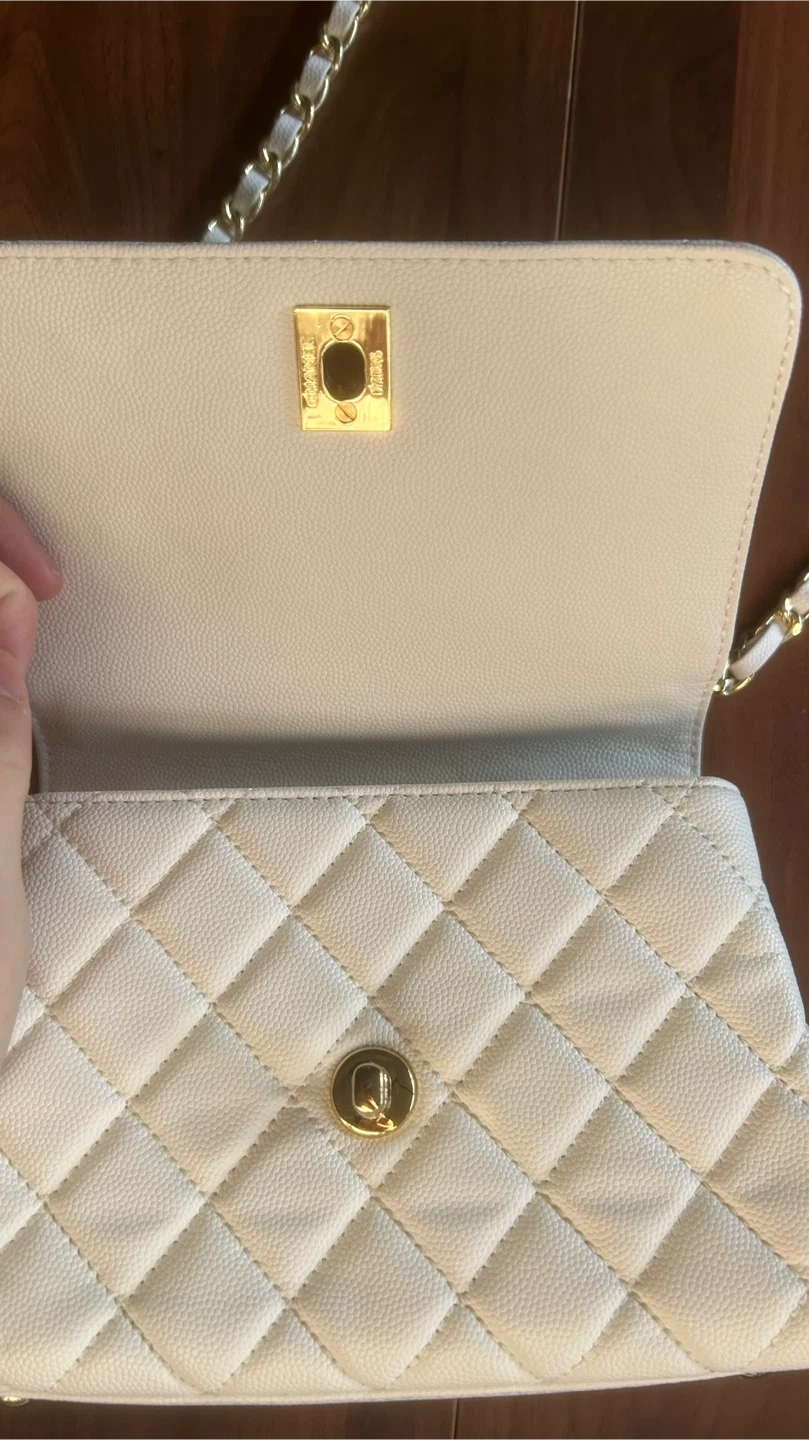 This chic white handbag features classic diamond quilting and a secure gold clasp. It has a top handle and a detachable gold chain strap for versatile carrying options. Interior has a zip pocket.