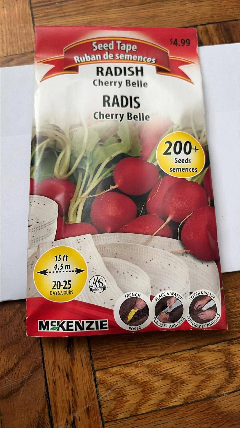 Get ready to plant with this McKenzie Radish Cherry Belle seed tape Selling for 0.75 ! It contains 200+ seeds and the tape is 15 ft (4.5 m) long. The package says you can expect sprouts in 20-25 days. Originally priced at $4.99.