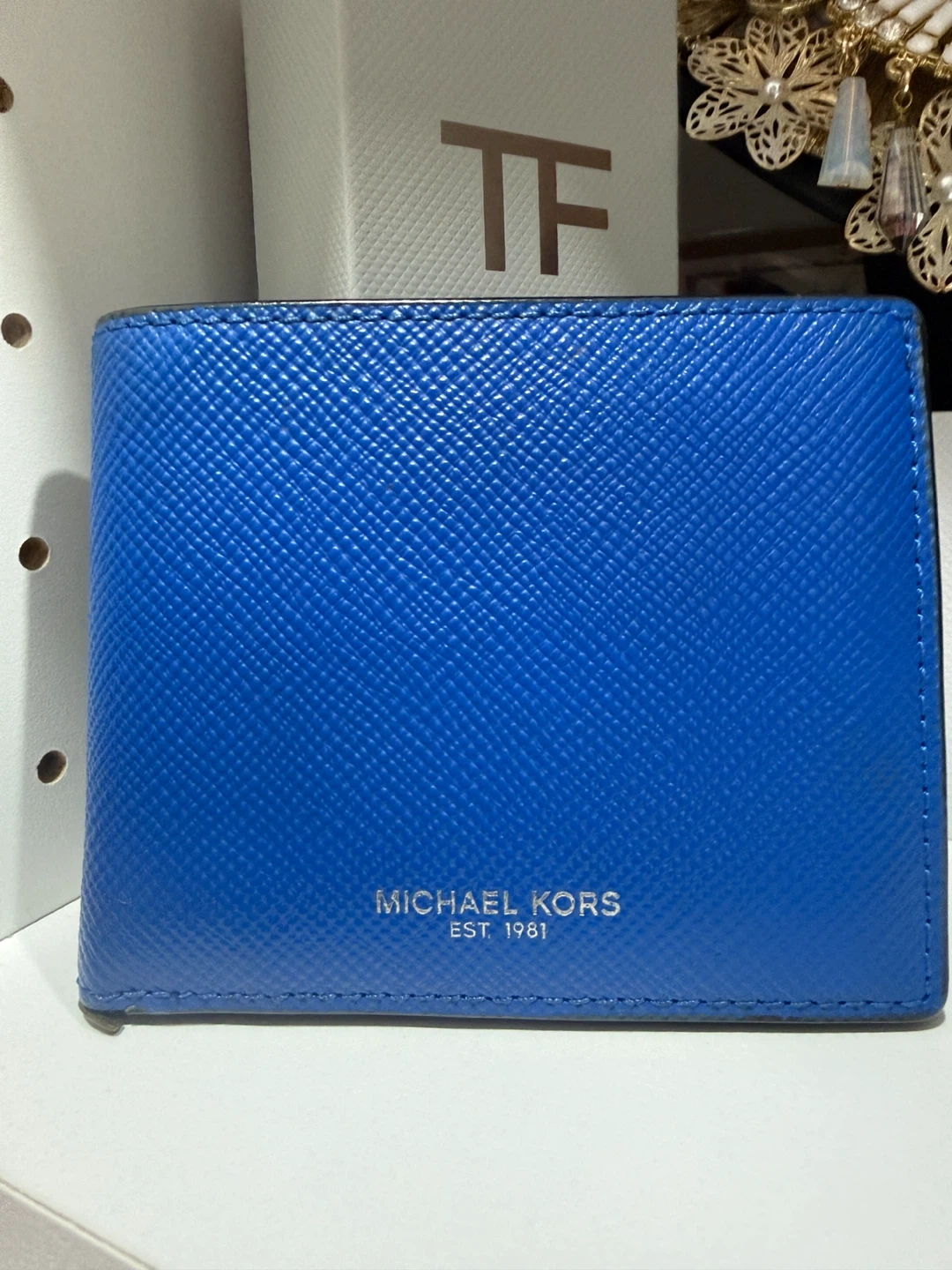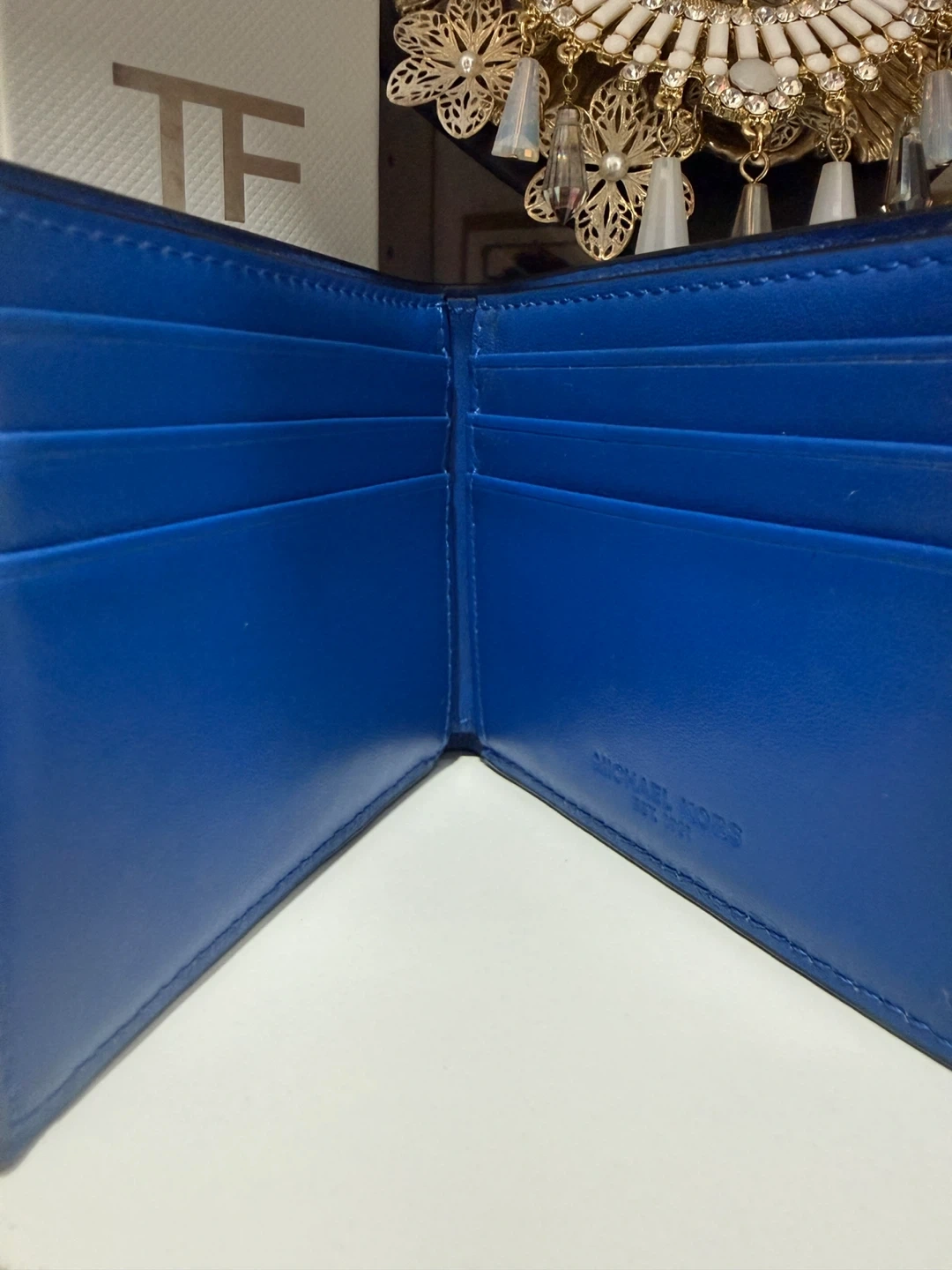 Blue leather bi-fold wallet. Features multiple card slots and a bill compartment. It's a compact and stylish accessory.