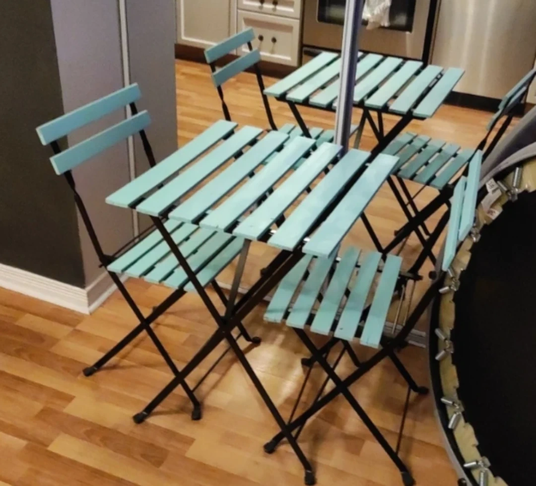 This is the IKEA tarno set, sanded and spray painted in green (specifically Behr chalk decorative spray paint, surf matte). It hasn't been coated for outdoor use, and are some imperfections in the wood.