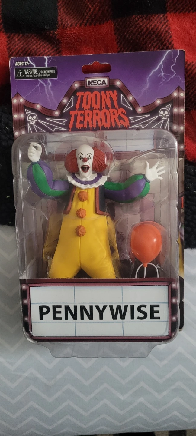 This NECA Toony Terrors action figure features Pennywise from IT. It's packaged and comes with a balloon accessory. This collectible is for fans of horror movies.